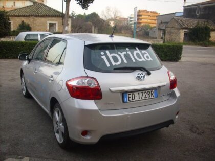 Tortoreto Lido. La Toyota amplia la gamma dei veicoli ibridi (doppia alimentazione Benzina ed elettrica), affiancando all’ormai nota Prius la versione Ibrida della berlina Auris. La versione ecologica della media giapponese è proposta con un motore ibrido (Benzina + Elettrico) 1800 da 136 cv, negli allestimenti Active ed Executive. Esternamente l’Auris presenta un corpo vettura moderno ed elegante, classico nelle forme molto europee (forme tondeggianti e sportiveggianti che affascinano il pubblico del vecchio continente). Accattivante il frontale sporgente e bombato nella parte del paraurti con una sportiva dinamicità creata dalla linea ondulatoria della mascherina cromata, mascherina ben incorniciata dai grandi gruppi ottici di forma trapezoidale. Anche posteriormente troviamo delle bombature e delle sporgenze in coda: anche qui il paraurti è sporgente e bombato per creare dinamismo e forme avvolgenti, mentre i gruppi ottici richiamo nella forma trapezoidale i fari anteriori. Internamente l’Auris HSD presenta un abitacolo curato, molto comodo, spazioso e ben sfruttabile nel complesso, tecnologicamente all’avanguardia. Tecnologia che internamente è concentrata nella consolle centrale dove troviamo in posizione rialzata lo schermo del navigatore – sistema di intrattenimento. Immediatamente sotto abbiamo i comandi del clima automatico bidona e per concludere vi è la piccola leva del cambio automatico a variazione continua (stesso cambio blu elettrico visto sull’altro prodotto ibrido di casa Toyota, la Prius). Completo e retroilluminato blu elettrico è il quadro strumenti, dove troviamo oltre alle consuete spie le indicazioni per una guida ecosostenibile e le indicazioni di funzionamento della tecnologia ibrida. Ed ora il momento del test drive: l’Auris provata è stata la 1800 HSD Executive da 26600 €. La seconda auto ibrida di casa Toyota, si presenta sul mercato italiano forte di una svolta ecologica ed ecosostenibile che sta vivendo in questo periodo il mercato dell’auto. Come sulla Prius, anche sull’Auris il motore elettrico funziona fino a 45 km/h per poi accoppiarsi a quello termico, per tornare a funzionare quando la velocità torna a scendere al di sotto della soglia dei 45 km/h. Su strada l’auto, grazie all’accoppiata motore termico – motore elettrico, è ecologicamente al top (Euro V come classe di emissioni, consumi contenutissimi e costi di gestione irrisori), ma non solo. È briosa e potente, silenziosissima in modalità elettrica e con un brusio appena accennato quando funziona il motore a benzina, è maneggevole e pratica, e il cambio automatico a variazione continua è l’ideale sia per brevi spostamenti che per lunghi viaggi grazie a una eccezionale fluidità di marcia. Infine il listino prezzi: si va da 21900 € della 1800 HSD Active ad arrivare a 23700 € della 1800 HSD Executive (Ibrido).
