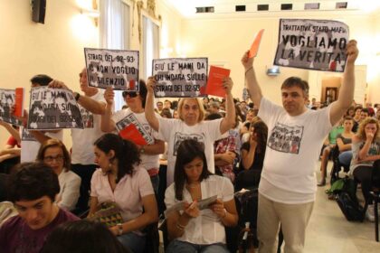 Nel corso dell’intervento alcuni presenti tra il pubblico hanno mostrato cartelli in difesa della magistratura che indaga sulle stragi del ’92 e ’93.