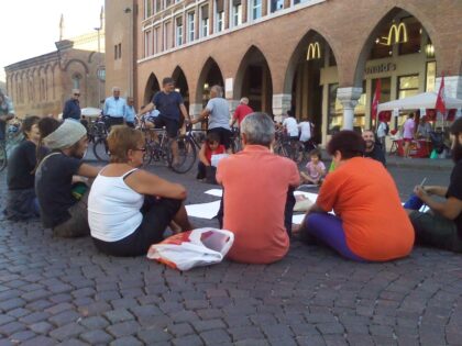 Alle 17.45 una trentina di persone si è seduta in cerchio attorno ad alcuni cartelloni bianchi sui quali avrebbero potuto scrivere: dopo una breve introduzione di Corridoni, il megafono è cominciato a passare di mano. L’iniziativa, che ha attirato l’attenzione di alcuni passanti, è durata fino alle 23.