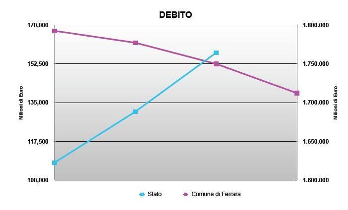 Dal 2009 al 2011 lo stock di debito pubblico dell’amministrazione statale cresce del 8,72%. Dal 2009 al 2012 il debito del Comune di Ferrara diminuisce del 23,40%.