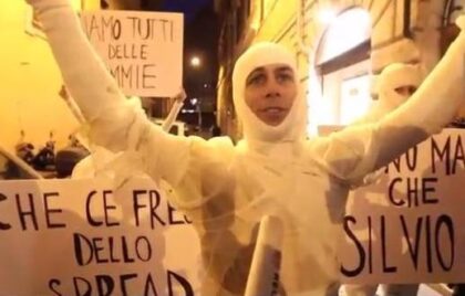 I quattro performer si sono presentati bendati come mummie davanti al Residence di Ripetta a Roma, dove era in corso la presentazione del libro di Bruno Vespa. Ospite d’onore l’ex premier tornato a sponsorizzare se stesso a Palazzo Chigi.