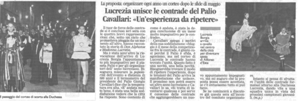 …e proprio grazie al successo di quell’evento, il Comune e l’Ente Palio promisero di preparare un progetto per un evento che si doveva svolgere ogni anno. (vedi intervista a Giorgio Cavallari, Presidente dell’Ente Palio nel 2002)