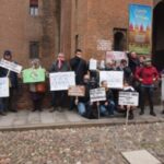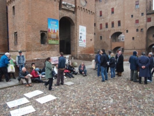L’informazione ambientale è imbavagliata davanti al Castello Estense. Poco più di una trentina di ambientalisti si sono radunati questa mattina sotto la sede della Provincia di Ferrara per protestare e rivendicare il diritto di accedere alle informazioni ambientali prodotte dalle amministrazioni pubbliche, in particolare della Provincia che “continua nell’ostruzionismo informativo sui problemi ambientali del territorio negando l’accesso a informazioni che dovrebbe essere pubbliche, adducendo motivazioni assurde e invocando una normativa che non ha più senso”. A denunciare questa situazione definita “omertosa” è il medico igienista Luigi Gasparini che ha radunato per la sua battaglia in nome della trasparenza, un nutrito gruppo di associazioni ambientaliste: comitato FerrAriaSalute di Malborghetto di Ferrara, associazione Amici della Terra di Ferrara, comitato spontaneo No Triv a Fe di Ferrara, gruppo spontaneo No Triv di Cento, gruppi dell’Unione Valli e delizie di Ostellato e del M5S di Ostellato, Gad (Gruppo Autonomo Discariche) di Casumaro, gruppo “Amici di Beppe Grillo – 5 Stelle per Cento e Frazioni”, gruppo “Cento in Movimento”, gruppo M5S di Ferrara, gruppo M5S di Argenta, gruppo M5S di Codigoro.