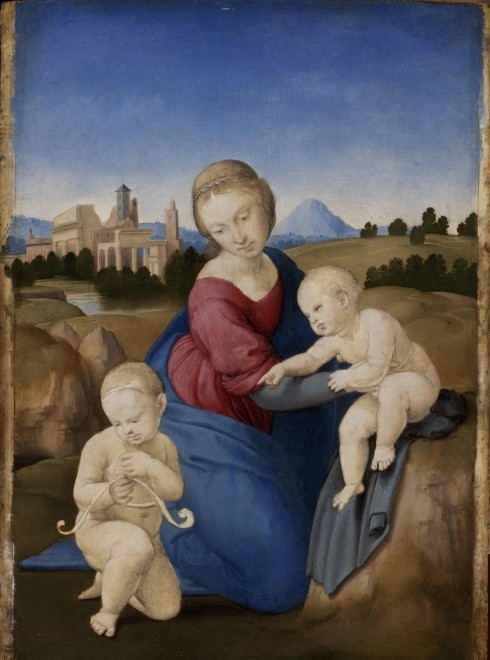 Il dipinto rappresenta una scena ampia e soleggiata distesa di paesaggio, e non presenta difficoltà iconografiche: la Madonna, in una complessa e insieme elegante posa sorregge il piccolo Gesù, che indica san Giovannino, assorto nella contemplazione di un sottile cartiglio. È un piccolo e poetico episodio dal sapore famigliare: non c’è accenno di aureole, i due bambini sono completamente nudi, la Madonna è vestita e acconciata con semplicità. La composizione si ispira in modo esplicito a Leonardo, conosciuto e studiato attentamente da Raffaello durante i quattro anni passati a Firenze; ma sullo sfondo appaiono i ruderi del foro Romano, dipinti con precisione topografica, a riprova di una conoscenza diretta e di una serena e convinta “immersione” nella classicità.