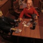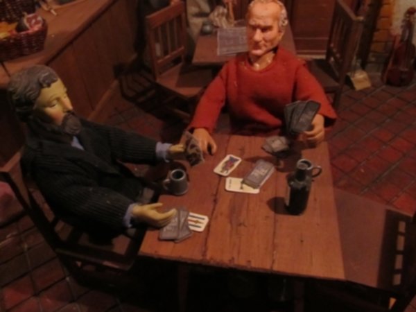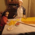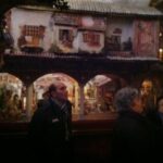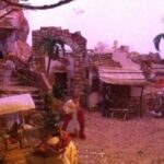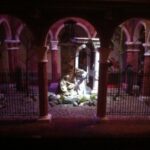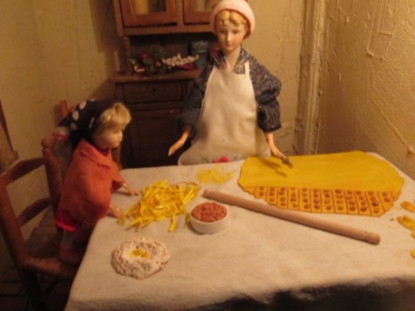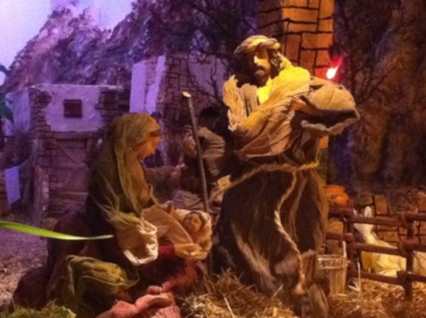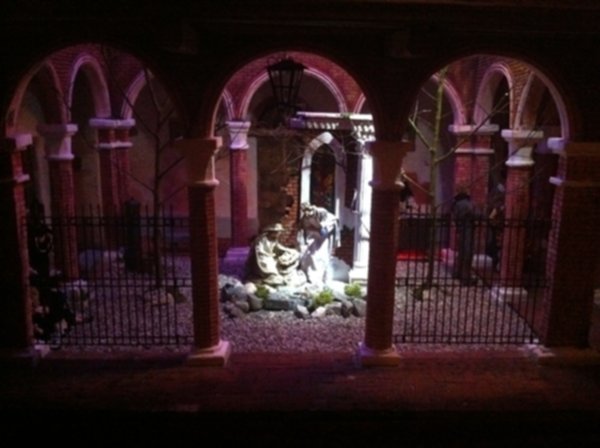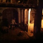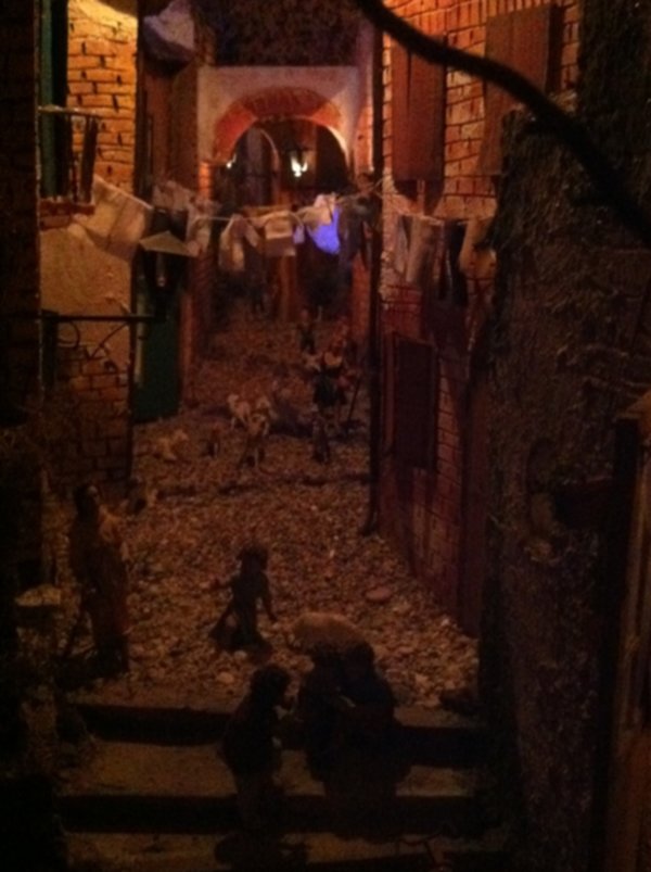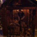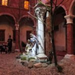 Non mancano gli scorci di vita quotidiana del tempo; in una casa di due piani in cucina vediamo un padre che legge una storia ai due figli dondolandosi sulla sedia mentre al piano di sotto la mamma prepara la cena, poco più in là in un’osteria c’è aria di festa, si balla e si gioca a carte (ovviamente romagnole). Nella casa affianco una simpatica ‘zdora’ sta preparando i cappellacci di zucca mentre al piano di sopra la nonna sta sistemando il prete sotto le coperte del letto. L’ambientazione contadina si ‘eleva’ nel contesto in cui è posta la natività che è illuminata da una luce bianca che le da risalto all’interno dell’intero presepe. La struttura in cui è inserita la natività è un chiostro rinascimentale, assai simile a quello retrostante Piazzetta Sant’Anna in centro a Ferrara, e a sua volta le figure di Maria, Giuseppe e Gesù sono all’interno di un tempio romano in rovina. “Le interpretazioni filosofiche e teologiche sulla scena della natività di questo presepe – sottolinea Mauro Molfetta, uno dei volontari- possono essere molteplici e lasciamo che il visitatore se ne crei una propria, la nostra è quella che vede nascere il cristianesimo sulle rovine del paganesimo romano”. Oltre al presepe principale, nelle sale parrocchiali, è visitabile anche una mostra di presepi, delle più disparate fattezze e misure, realizzati da privati.