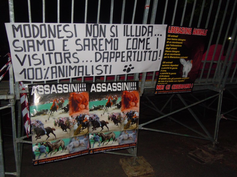 I 100% animalisti sono attivi contro il Palio dal 2007 – l’anno successivo alla corsa in cui morirono due cavalli – con duri presidi e azioni di disturbo. “Ogni anno, escluso l’anno del terremoto (per rispetto verso le vittime, rispetto che gli organizzatori non hanno avuto) – si legge nella nota dell’associazione – i nostri militanti hanno fatto sentire la loro voce a difesa dei cavalli, oltre a innumerevoli blitz con affissione di manifesti e striscioni alle sedi e alle abitazioni degli organizzatori del palio o dei politici responsabili”.