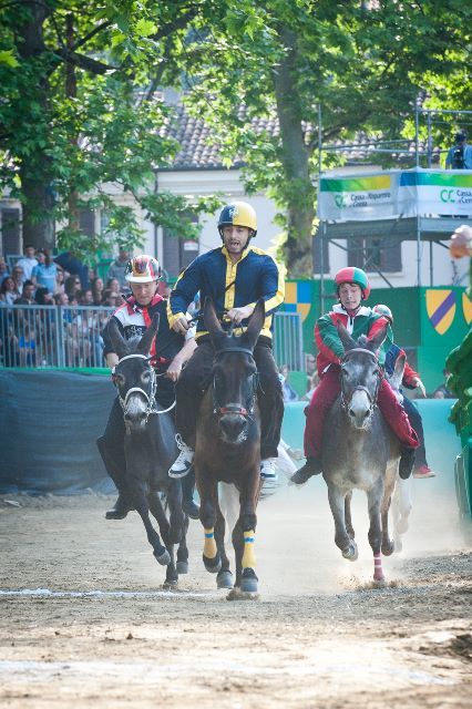 Il dominio rossoverde è proseguito nella corsa delle asine, dove la contrada da battere era quella di San Benedetto, vincitrice lo scorso anno. L’accoppiata che aveva dominato l’edizione 2014, composta dall’asino Santino Rocchitto e dallo staffiere Laura Zanghirati, è stata riproposta anche quest’anno ma questa volta è partita male, lasciando subito la testa della corsa a San Giacomo con Luca Veronesi su Niederra. Erano proprio i loro favoriti dopo il successo a Querceta, il palio più importante d’Italia per quanto riguarda gli asini. Ed ecco il colpo di scena: al secondo e penultimo giro, il sorpasso di Don Pippo di San Luca non ha lasciato scampo a nessuno: lo staffiere Andrea Mattiolo ha guidato senza problemi tutto il terzo giro andando a vincere. Un trittico di vittorie che fa sfiorare l’impresa del poker ai rossoverdi, che lasciano piazza Ariostea in festa.
