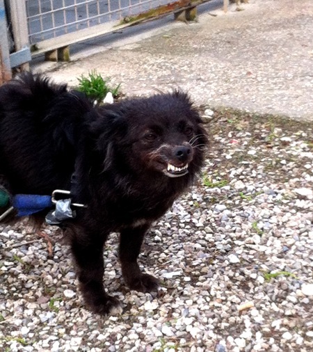 Dolly ha 10 anni e una storia un po’ triste alle spalle. È paralizzata alle zampette posteriori, ma ormai si è ben abituata al suo carrellino. Nella foto la sua espressione non è di aggressività ma di felicità: con le persone di cui si fida, infatti, ama molto fare grandi sorrisi, a conferma che la vita può avere anche per lei momenti di serenità e di affetto.