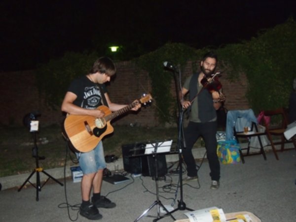 Proprio di fianco a questa biblioteca per lo scambio libero di libri e saperi, si sono esibiti, nell’atmosfera intima e accogliente che caratterizza le cene di quartiere, i TwinPeas che hanno aperto la loro performance ringraziando gli chef. Complimenti diretti agli stessi residenti dato che ognuno di loro ha portato viveri e bevande da casa per rendere il buffet una vera festa condivisa. Tra sede spaiate e menu vario si gustano i piatti della buona cucina casalinga mentre le note della chitarra fingerstyle di Roberto Barcellini e del violino folk di Gianluca Visalli si disperdono nell’aria frizzante di un lunedì sera di fine estate.
