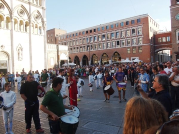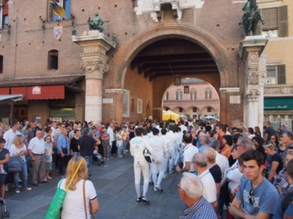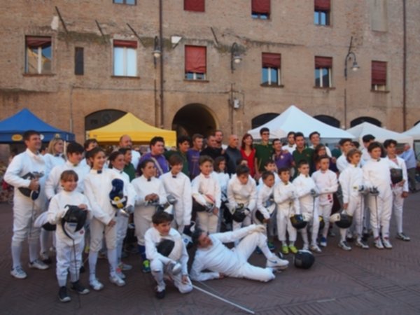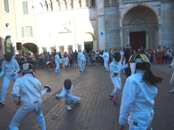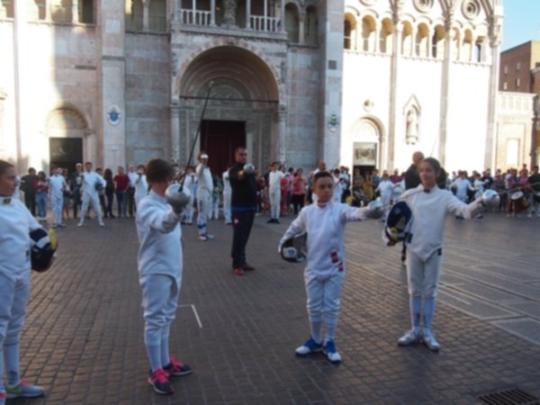 L’Accademia Bernardi scende in piazza a ritmo dei tamburi del palio e delle note del pianoforte. Un accompagnamento musicale che ben si addice allo sport presentato, la scherma, che si caratterizza per l’eleganza e la forza dei movimenti. Gli affondi e le prese di ferro a tempo di musica richiamano un folto numero di curiosi che fermano la propria ‘vasca’ domenicale per assistere al breve flash mob organizzato dagli schermidori in piazza Cattedrale.