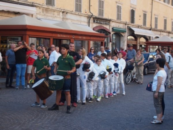 Ad accompagnare i piccoli e i veterani in questa sfida lampo sono i giovani contradaioli di Santa Maria in Vado e Santo Spirito e la pianista Elisa Piffanelli. “Una nota di merito va a lei che ha ideato la coreografia e all’Ente Palio che ha aiutato a coordinarci con le contrade – spiegano gli organizzatori dell’accademia di scherma – per la buona riuscita di un evento che ha portato più affluenza più del previsto”. Tanti i passanti che si sono radunati attorno agli schermidori, infatti, incuriositi dalle loro maschere e divise e dai loro movimenti forti ed eleganti, per uno sport meraviglioso ma ancora poco conosciuto.
