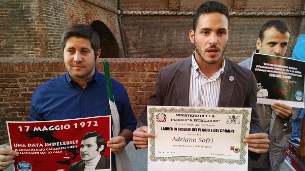 I manifestanti, muniti di bandiere di partito e Tricolore, oltre che di volantini che ricordavano l’omicidio del commissario Calabresi – per il quale, dopo un lunghissimo e controverso iter giudiziario, Sofri è stato condannato quale mandante a 22 anni di reclusione – si sono presentati davanti all’ingresso del Teatro Comunale, dove Sofri è stato ospite insieme al fumettista Zerocalcare e a Giovanni De Mauro a parlare di Kobane.