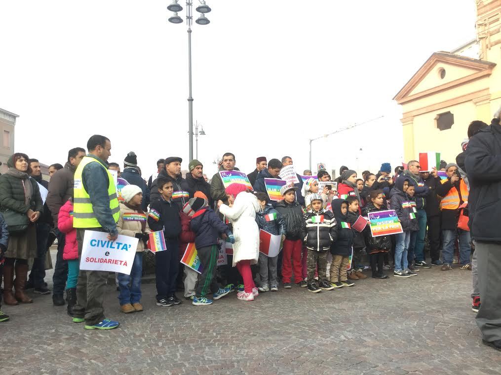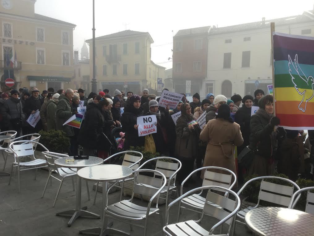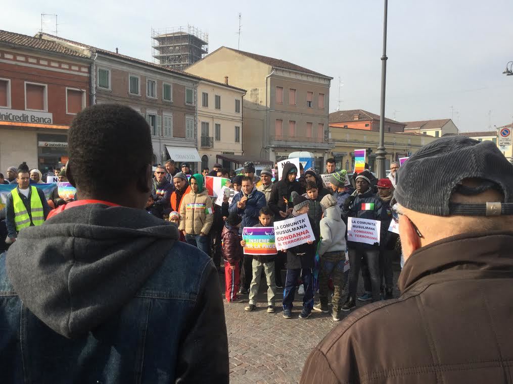 A giudicare dall’atmosfera che si respira a Bondeno, sembrano lontani anni luce i drammatici attentanti di Parigi, Ankara, Tunisi o Bamako che nelle ultime settimane hanno sconvolto il mondo. Quella di questa mattina è la manifestazione che molti stavano aspettavano, come dimostra la partecipazione numerosa, variegata e pacifica al corteo, per giunta senza nemmeno un istante di tensione in quella che è la ‘roccaforte’ della Lega Nord in Emilia-Romagna.