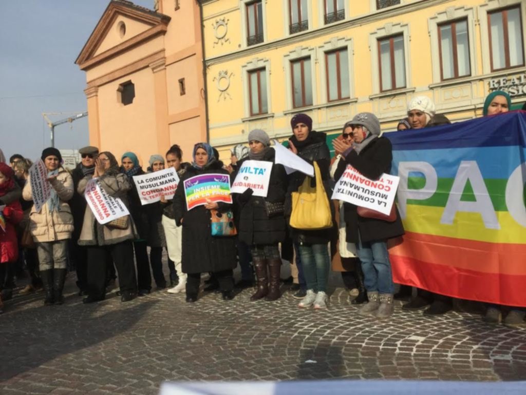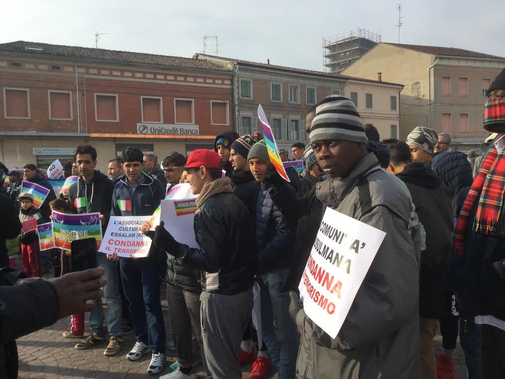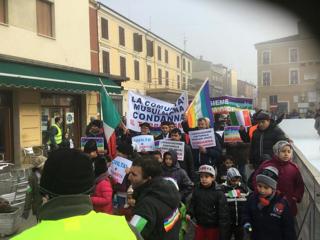 Bondeno. Sono circa 300 i musulmani di ogni età, sesso ed etnia che sfilano per la piazza Bondeno, davanti agli occhi incuriositi dei bambini che osservano dalla pista di pattinaggio e ai tavolini dei bar dove la città si incontra per fare colazione. Un corteo che dopo un paio di passaggi davanti agli stand natalizi raccoglie l’adesione anche di qualche decina di bondenesi e passanti, che si uniscono ai manifestanti aiutandoli a sorreggere cartelli e striscioni il cui contenuto non lascia spazio a interpretazioni: “L’Islam condanna il terrorismo”, “No alla violenza” o “Islam = pace”.