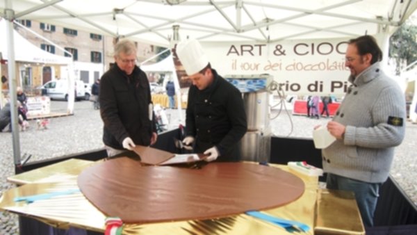 Il cuore di cioccolato batte nel cuore della città estense. L’omaggio alla festa di San Valentino è stato preparato dai mâitres chocolatiers per inaugurare la terza edizione di Art&Ciocc, il tour dei maestri cioccolatieri che fa tappa in piazza Castello da oggi, venerdì 12, fino a domenica 14 febbraio, giorno della festa degli innamorati.