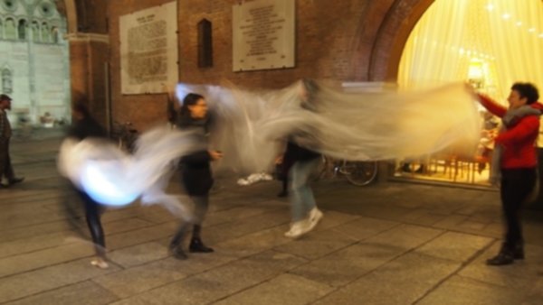 Le statue umane sono poi diventate ‘sentinelle’ al contrario, proponendo letture sulle forme di discriminazione e sulle modalità per combatterle. I testi, tratti da film, libri, blog, storie vere e canzoni, sono stati letti ai passanti che transitavano in piazza nel pomeriggio. Una vera e propria espressione mentale che è diventata corporea verso sera, quando gli organizzatori si sono cimentati in scatenate danze sotto un telo trasparente illuminato da alcune pile, creando un effetto luminoso che ricordava lo slogan della giornata. Il ballo è stato accompagnato dalla musicalità di bonghi, percussioni e di un fisarmonicista coinvolto a sorpresa sotto il volto del Cavallo.