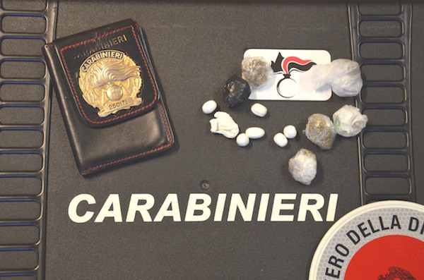 La perquisizione personale ha permesso di trovare nella sua bocca 7 dosi di cocaina per un peso complessivo di 5 grammi e nelle tasche 6 dosi di hashish per un peso complessivo di 7 grammi.
