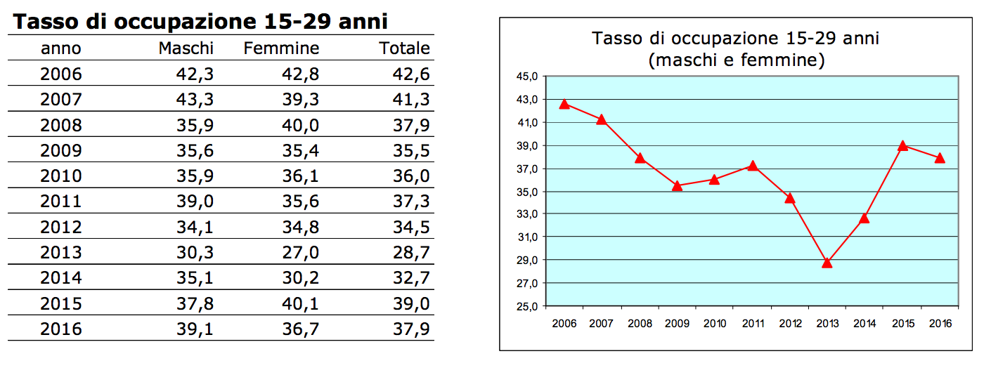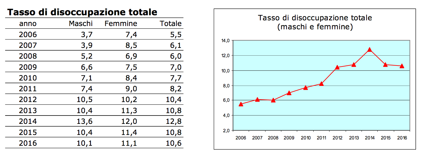 La serie storica 2006-2016. Il report offre anche la possibilità di guardare alla serie storica di 10 anni (a partire dal 2006 dunque) in cui si nota come il tasso di occupazione generale (15-64 anni) non abbia mai toccato vette così elevate come nel 2016, mantenendo i valori in (relativa) crescita per due anni di fila anziché subire un processo di frenata-ripartenza (sempre relative) di anno in anno. Il tasso di disoccupazione, invece, con i cali degli ultimi due anni, si è riassestato alle condizioni del 2012, ma rimane molto lontano rispetto a quello del 2006. I grafici sotto contribuiscono a spiegare meglio: