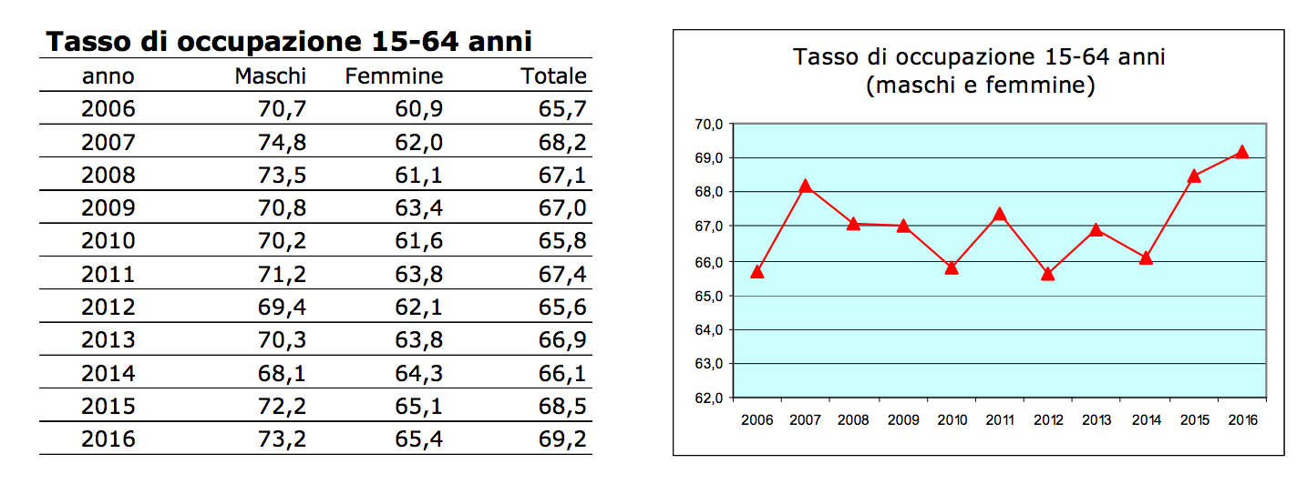 Ci sono differenze tra i generi. Ci sono però differenze rilevanti tra i generi. I maschi riescono infatti più facilmente a trovare lavoro o, meglio, aumenta maggiormente rispetto a quella femminile: “Il tasso di occupazione maschile 15-64 anni, attestandosi sul valore di 73,2%, cresce, rispetto all’anno precedente, di un punto percentuale – spiega la relazione dell’ufficio Statistica – mentre quello femminile, pari a 65,4%, aumenta di soli 0,3 punti”. Ma è un dato, quest’ultimo, la cui piccolezza quantitativa viene ulteriormente minata da un’altra considerazione: “L’incremento del tasso di occupazione femminile è in realtà dovuto al decremento di popolazione totale in età 15-64 anni (-300 donne rispetto all’anno precedente), dato che l’occupazione complessiva femminile non cambia rispetto al 2015, restando invariata a quota 27.500 nella classe 15-64 anni e a quota 27.900 nella classe 15-74 anni”.
