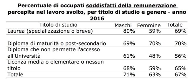 Cambia però la soddisfazione per i compensi, con grandi differenze tra i generi. Le cose sono diverse invece quando si parla di soddisfazione per i compensi percepiti, che “cala sensibilmente”: solo il 67% dei lavoratori si dichiara soddisfatto di questo aspetto ma (purtroppo) non dovrebbe sorprenderci più di tanto, “lo sono di più gli uomini delle donne, rispettivamente con il 71% e il 63% dei soddisfatti”. Anche qui, i meno contenti sono i diplomati senza possibilità di accesso all’università: “Di questi solo il 56% dichiara di essere soddisfatto, e tale quota scende al 48% solo relativamente al genere femminile (è pari al 61% per i maschi)”. Tra i laureati le cose vanno meglio, ma ancora una volta con grosse differenze tra i generi: “Quelli maggiormente soddisfatti per la remunerazione sono i laureati maschi (80%), mentre scende di oltre 20 punti percentuali la corrispondente quota relativamente al genere femminile, con solo il 59% di soddisfatte per la remunerazione”.