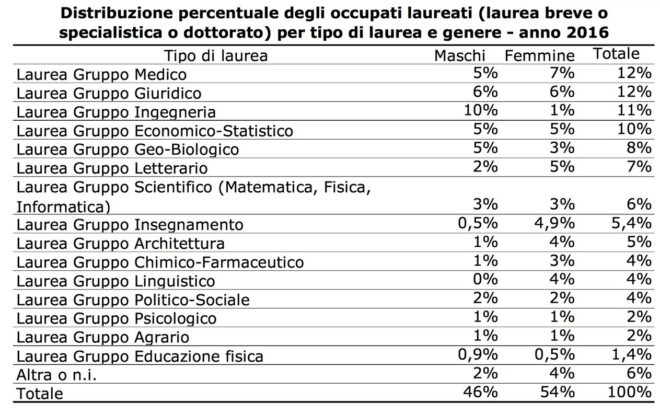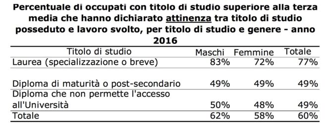 Titolo di studio e lavoro non coincidono, soprattutto per i diplomati. Tra chi ha un titolo di studio superiore alla terza media (quindi maturità e università), solo il 60% svolge un lavoro attinente con quel percorso, ma più si sale meno marcato è il dato. Infatti, tra i laureati quella percentuale sale al 77%, soprattutto tra i maschi che raggiungo il picco dell’83%, undici punti in più delle donne. Il tipo di laurea sembra essere un fattore fondamentale per trovare un lavoro attinente: “I laureati che svolgono maggiormente una professione attinente al tipo di laurea sono i laureati nel gruppo medico, nel 96% dei casi (100% relativamente alle donne del campione, 91% per gli uomini). Al secondo posto troviamo i laureati nel gruppo ingegneria e architettura, col 92% delle corrispondenze (96% per gli uomini, 80% per le donne). Un’elevata percentuale di lavori attinenti la troviamo anche nei laureati in discipline economico-statistiche (86%, col 92% per i maschi e l’80% per le donne), mentre nel gruppo giuridico, in quello scientifico e in quello letterario si registrano minori attinenze, scendendo a quote non superiori al 70%. Le minori correlazioni studio-lavoro le troviamo invece nei laureati del gruppo “altra laurea” (che comprende lauree del gruppo agrario, politico-sociale, psicologico, educazione fisica, sicurezza o altra laurea) col 62% delle attinenze (53% le donne, 72% gli uomini)”.