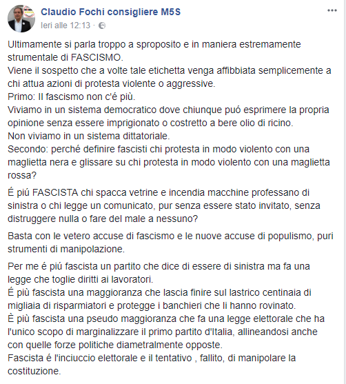 Probabilmente, dopo l’equivalenza musulmani-terroristi, l’etichetta “provocazione” non tarderà ad arrivare anche in questo caso per giustificare l’ultima elucubrazione storico-filosofica che il consigliere comunale del M5S Claudio Fochi consegna agli utenti su Facebook. Per il momento il consigliere spiega invece di mal sopportare l’etichetta “fascista” verso chi «attua azioni di protesta violente o aggressive», skinhead compresi. Mancano i caratteri fondamentali del fascismo: non c’è più il Duce, l’olio di ricino è stato abbandonato da tempo come arma di persuasione e punizione.