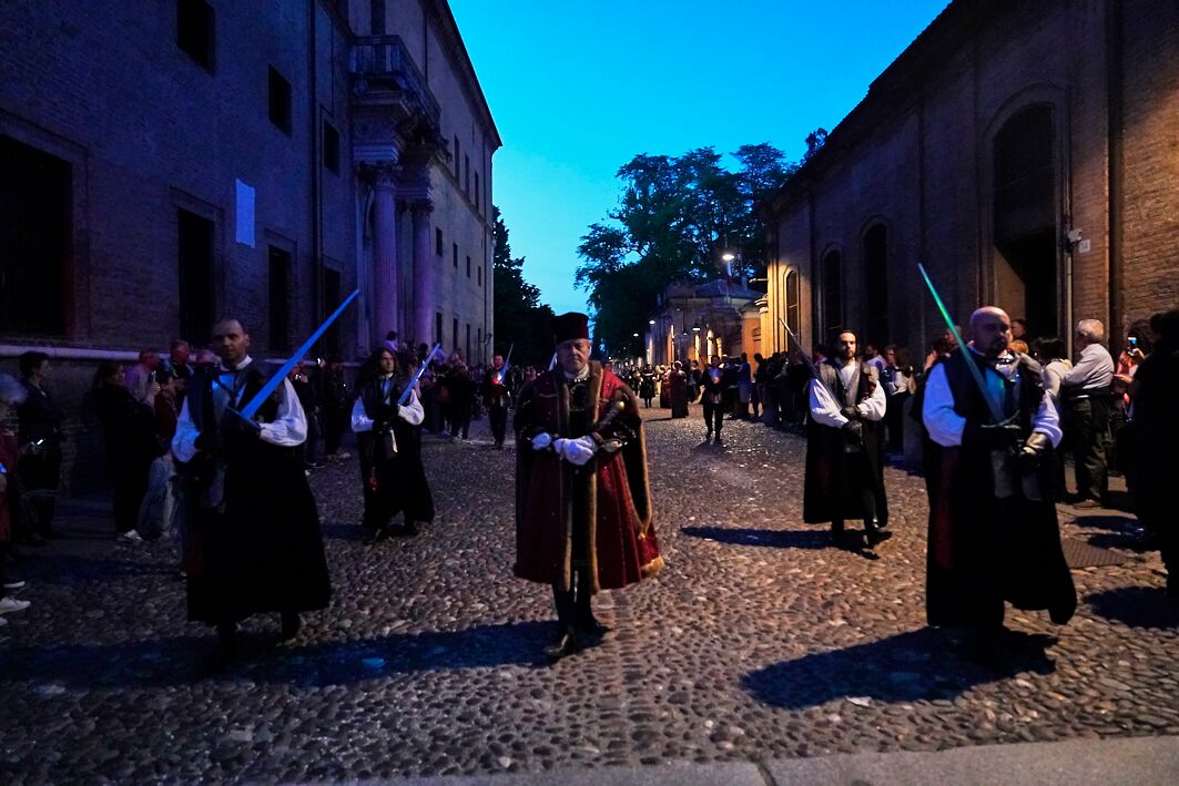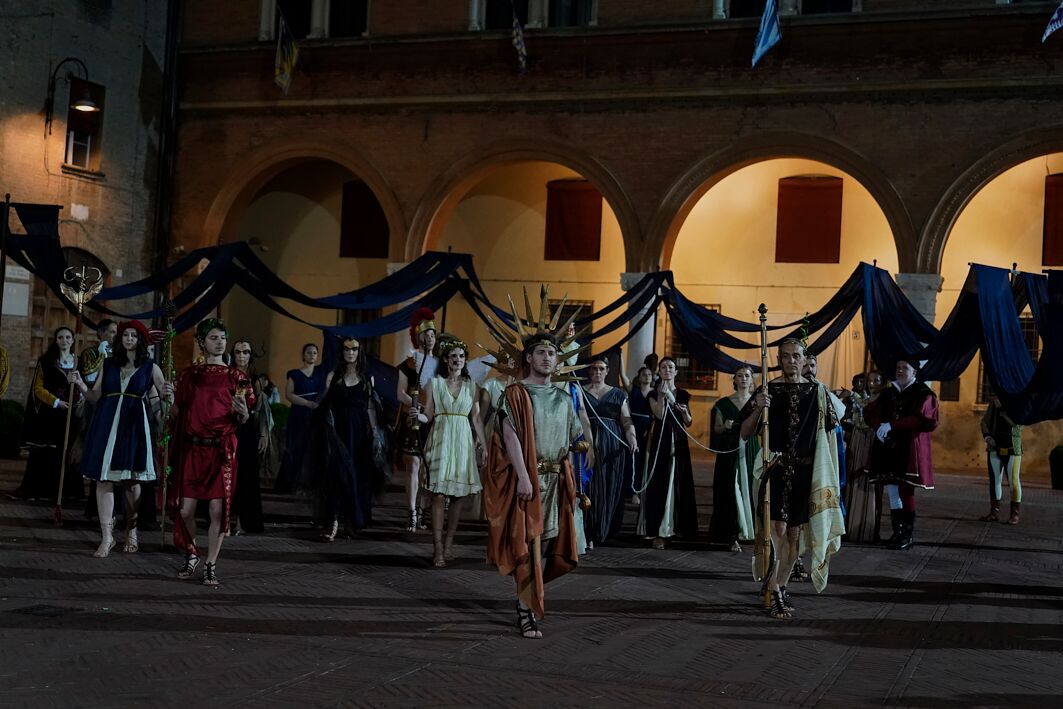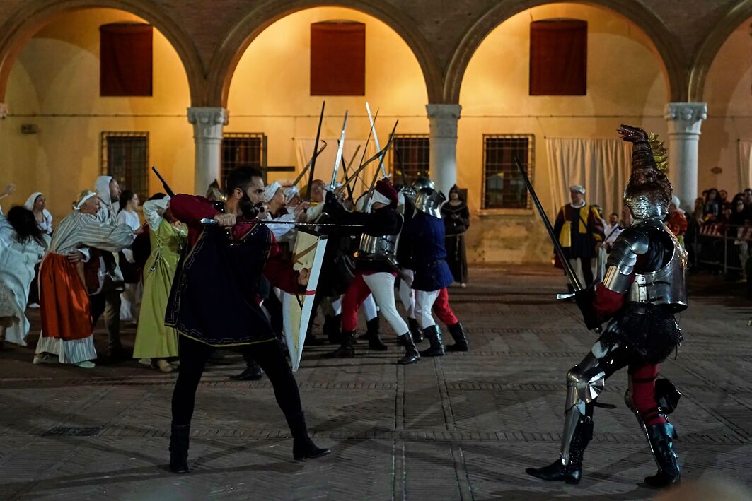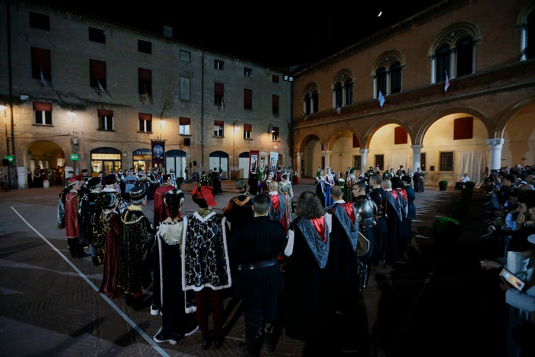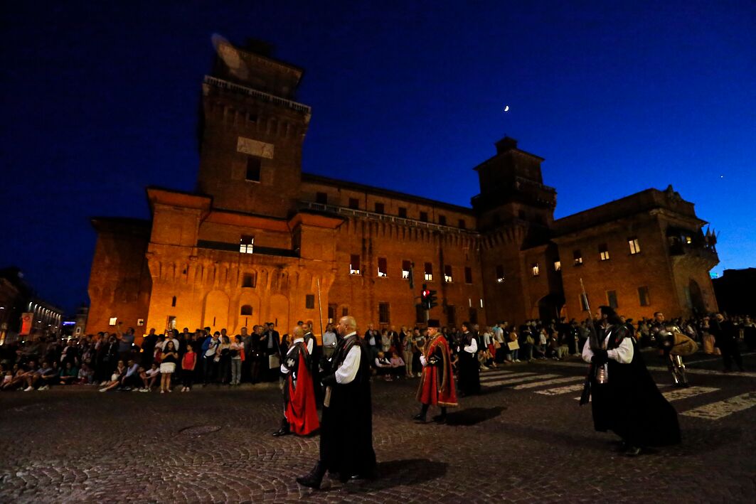 Qui, davanti alle autorità e a una piazza non gremita al massimo, è stata come di consueto la Corte Ducale a dare inizio agli spettacoli, rappresentando il rientro in città di Borso d’Este da Roma, dove Papa Paolo II lo nominò primo duca di Ferrara. Qui Borso fu accolto da Pellegrino Prisciani, da Mastro Guglielmo da Pesaro e da una città in festa. La festa lascia invece spazio alla sommossa nella rappresentanza di San Giorgio, che sceglie di proporre la rivolta popolare del 1317, quando la gente, stanca dei continui soprusi perpetrati dal vicario papale Roberto d’Angiò scese in strada per richiamare gli Este alla guida di una città provata.