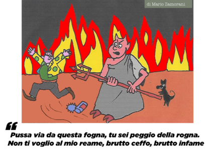 Si tratta della storia “Le avventure di Sor Maono (e re codino)” che sbeffeggia in rima baciata il suo vice e la sua pettinatura. È realizzata dal Radicale Mario Zamorani, candidato per + Europa, che l’ha condivisa via social e distribuita al banchetto elettorale. In una vignetta, il diavolo dice a Nicola Naomo Lodi: “Pussa via da questa fogna, tu sei peggio della rogna. Non ti voglio al mio reame, brutto ceffo, brutto infame”.