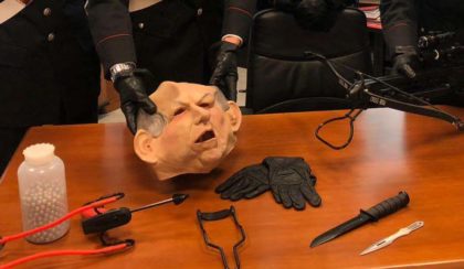 Quando l’uomo è stato fermato dai carabinieri era ancora nel giardino di casa, sul volto aveva la maschera dell’ex segretario di Rifondazione Comunista e al seguito aveva la balestra. In casa gli sono stati trovati dei coltelli, una fionda con biglie d’acciaio e dei coltelli, oltre a una divisa dell’Esercito Italiano sulla quale sono in corso degli accertamenti. Durante il tentativo di rocambolesca fuga ha quasi messo sotto con l’auto i carabinieri e per questo gli è stata contestata anche la resistenza a pubblico ufficiale.