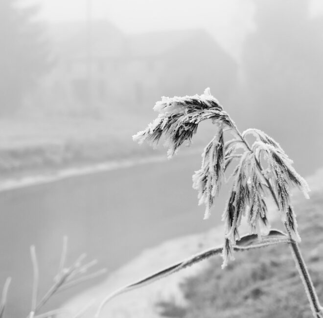 La foto è stata scattata nella campagna di Argenta, il ghiaccio sulle piante, la nebbia, un casolare abbandonato, volutamente sovraesposta trasmette il calore dell’inverno.