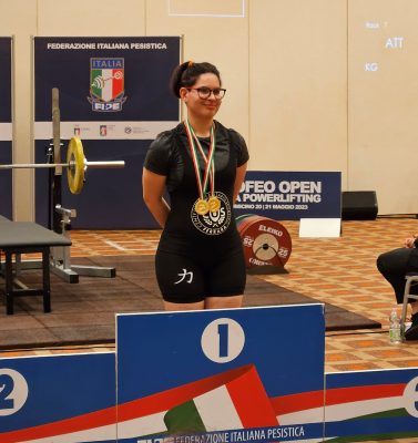 Azzurra si è messa al collo due medaglie d’oro vincendo la categoria Juniores ed anche quella Open con una alzata di 60 kg alla seconda prova che vale il nuovo titolo italiano di categoria. Viene ritoccato così il suo precedente record di 55 chili stabilito a marzo nel corso della Coppa Italia.