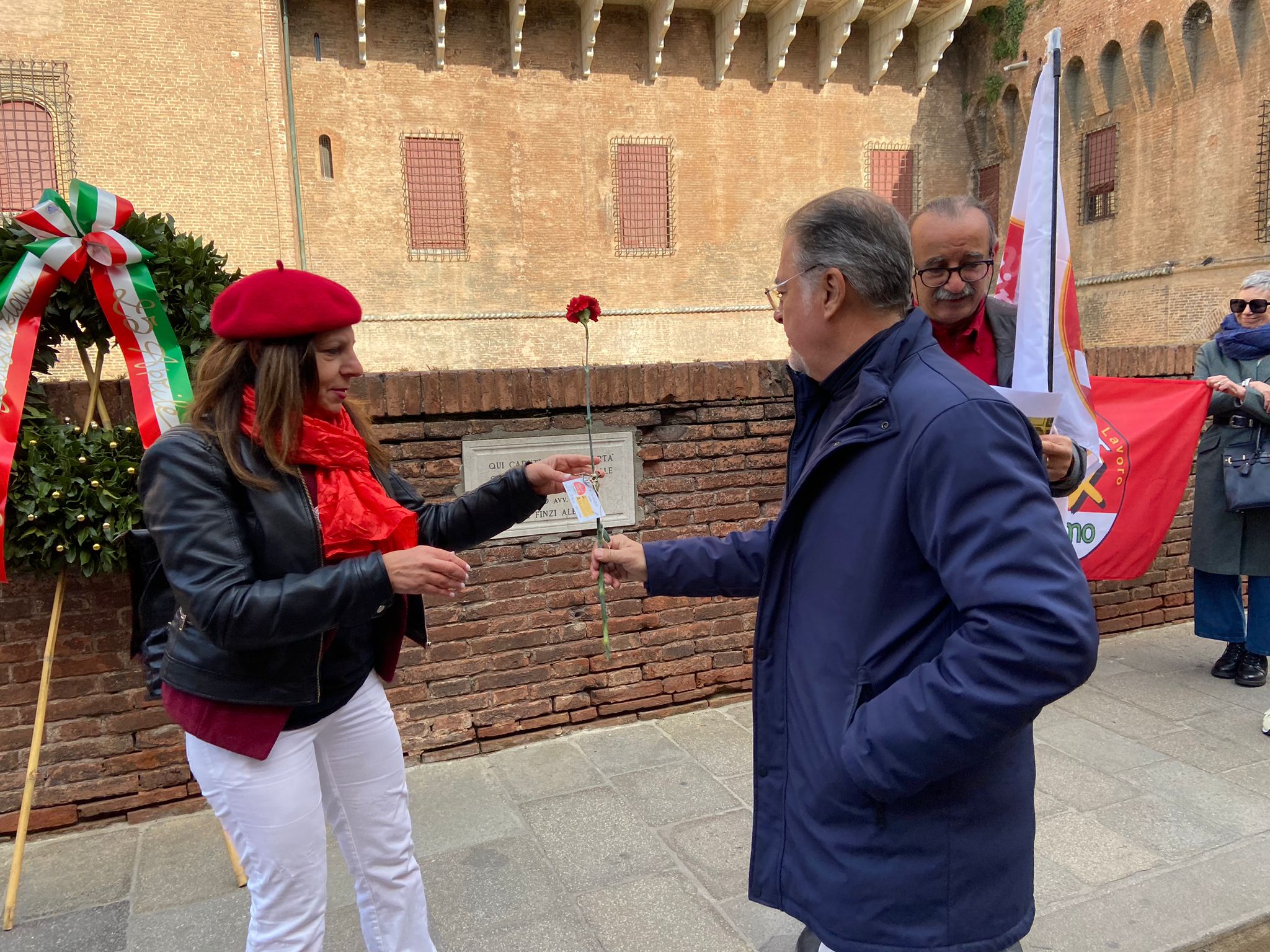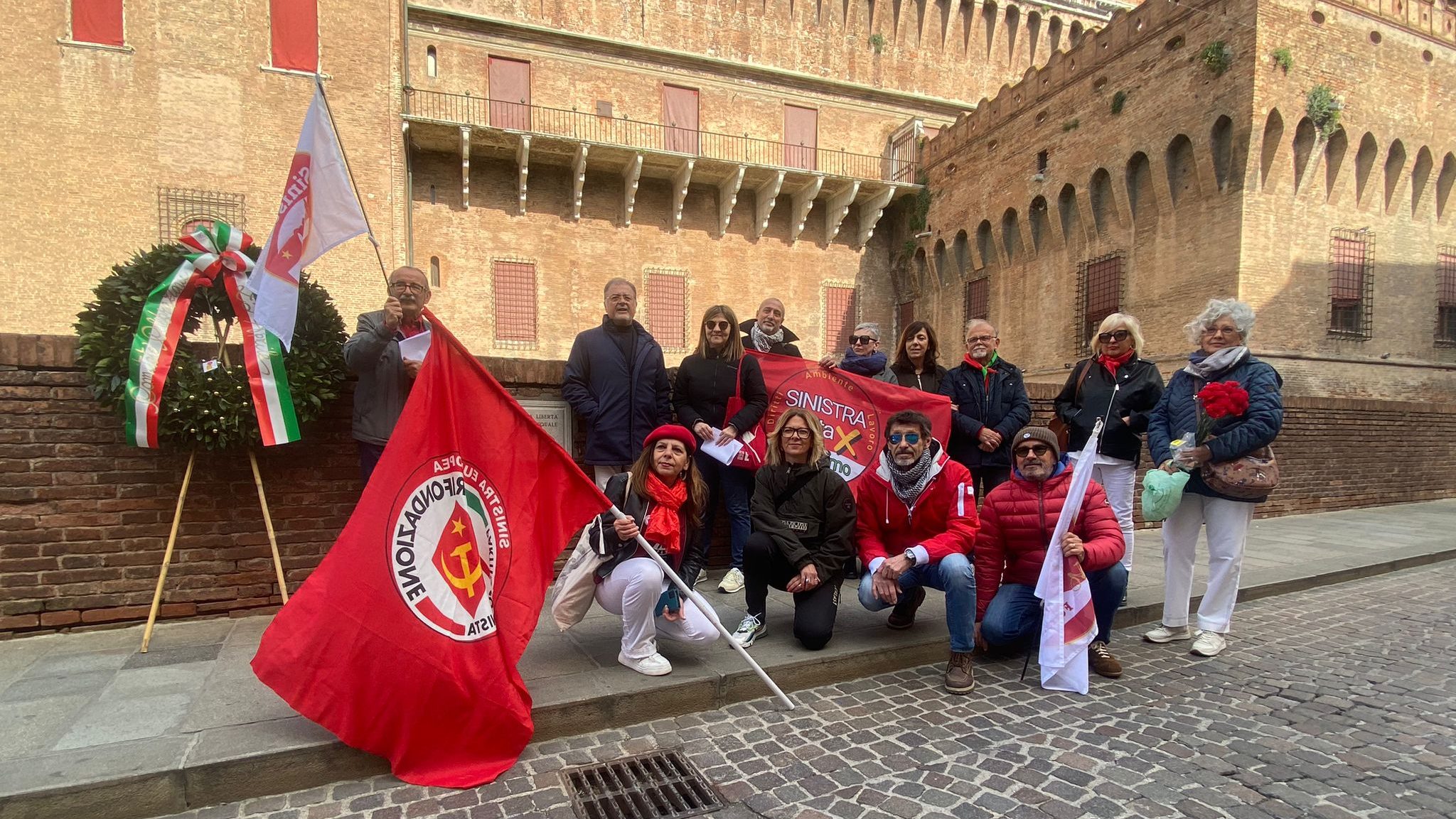 “L’Italia resiste, Ferrara resiste“. C’è questo messaggio nei bigliettini che, insieme ai garofani rossi, ieri (giovedì 25 aprile) i candidati de La Sinistra Unita per Anselmo hanno lasciato nei luoghi della città simbolo della lotta al nazifascismo, a partire dal muretto del Castello Estense dove si consumò il terribile eccidio del 15 novembre 1943, dove furono fucilate undici persone.