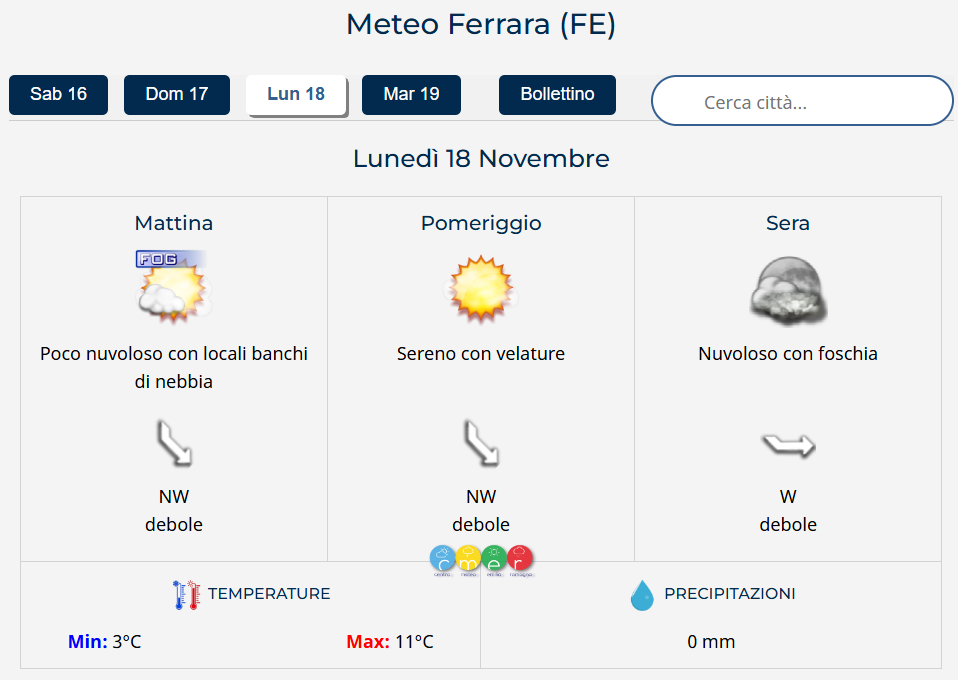 Stato del cielo: coperto, con foschie dense e locali banchi di nebbia specie tra notte e mattino. Precipitazioni: assenti. Temperature: minime comprese tra +3°C e +5°C, massime comprese tra +8°C e +10°C. Venti: deboli da sud-est, con locali rinforzi tra pomeriggio...