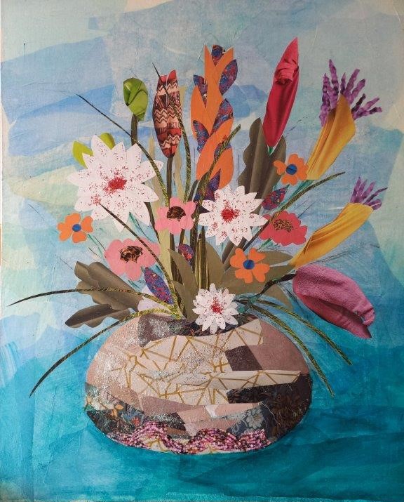 In parete opere pittorichee collage di vari materiali ispirate a vasi di fiori come simboli di immaginarie città ed espressione di antichi sentimenti.