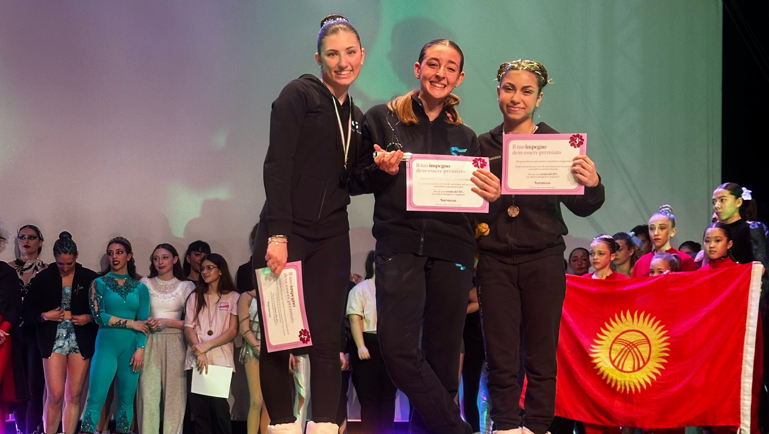 Vanessa Tomasi ha raggiunto un risultato straordinario, aggiudicandosi il primo posto nella categoria Cerchio Aereo Amateur U18, seguita dalla compagna di squadra Giulia Leoni al secondo posto nella stessa categoria, con pochissimi punti di differenza, che conquista un meritatissimo argento confermando il valore della squadra grazie alla sua esibizione delicata ed elegante.