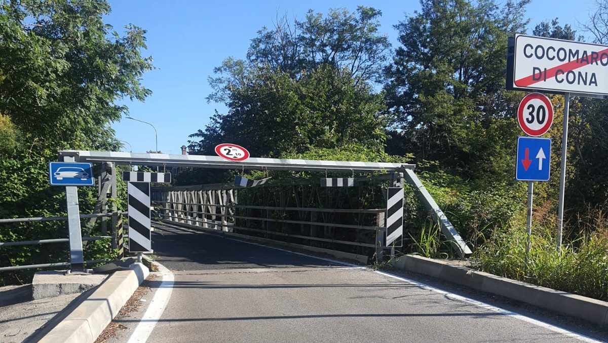 Cocomaro di Cona. Strada interrotta a Cocomaro di Cona dopo che un mezzo più alto di 2.10 m ha colpito la segnaletica che indica il limite di accesso in altezza al ponte Bailey.