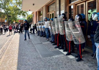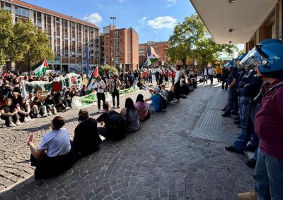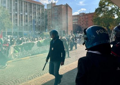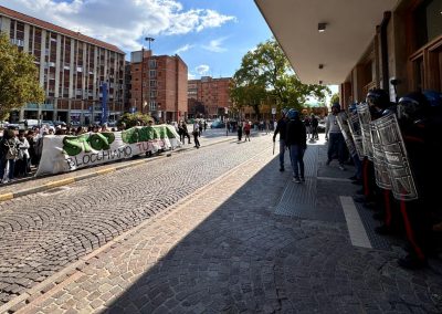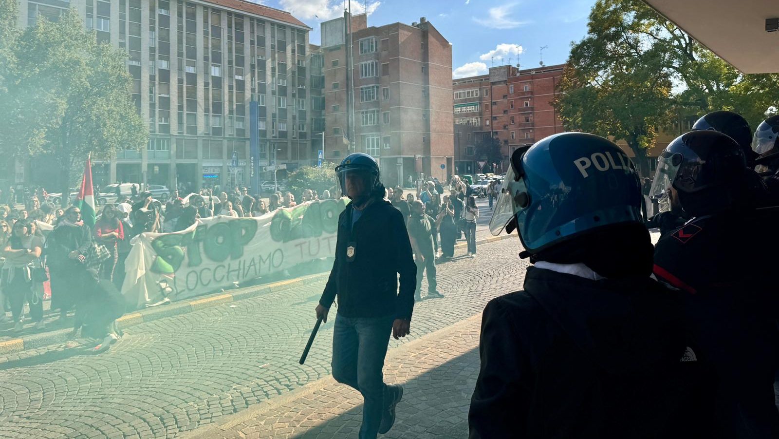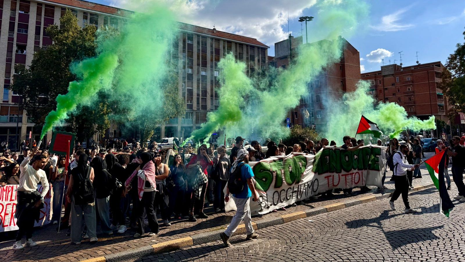Aria tesa nel piazzale davanti alla stazione di Ferrara dove, intorno alle 14 di venerdì 3 ottobre, circa trecento manifestanti – che in mattinata avevano partecipato al corteo organizzato dopo lo sciopero generale nazionale proclamato da Cgil e Usb – hanno spontaneamente raggiunto lo scalo ferroviario con l’obiettivo di occupare i binari e fermare i treni.