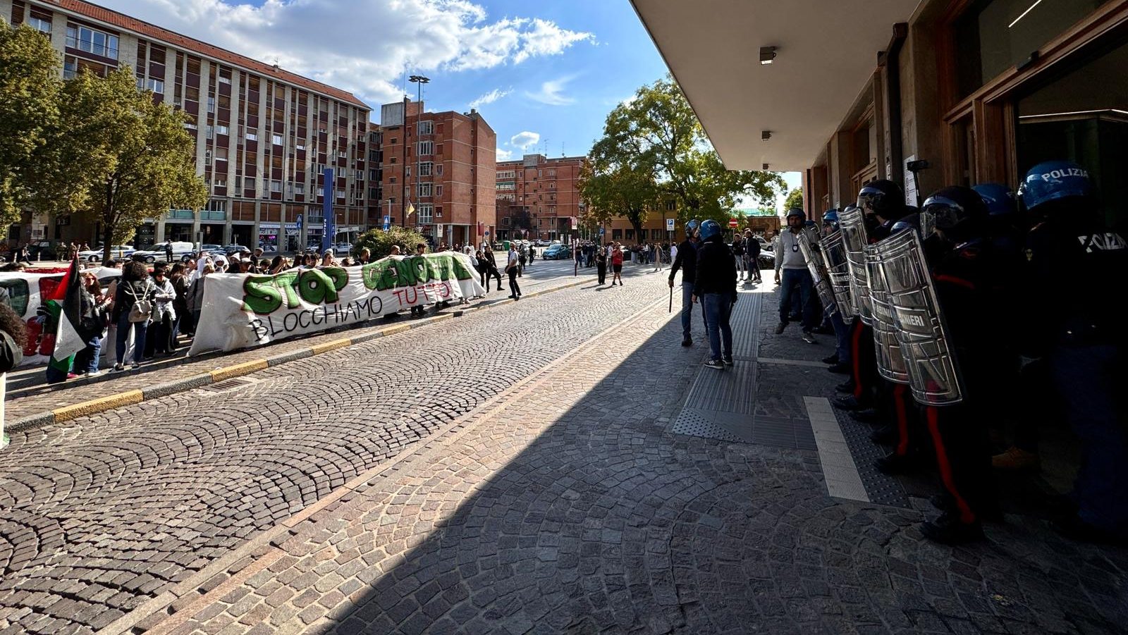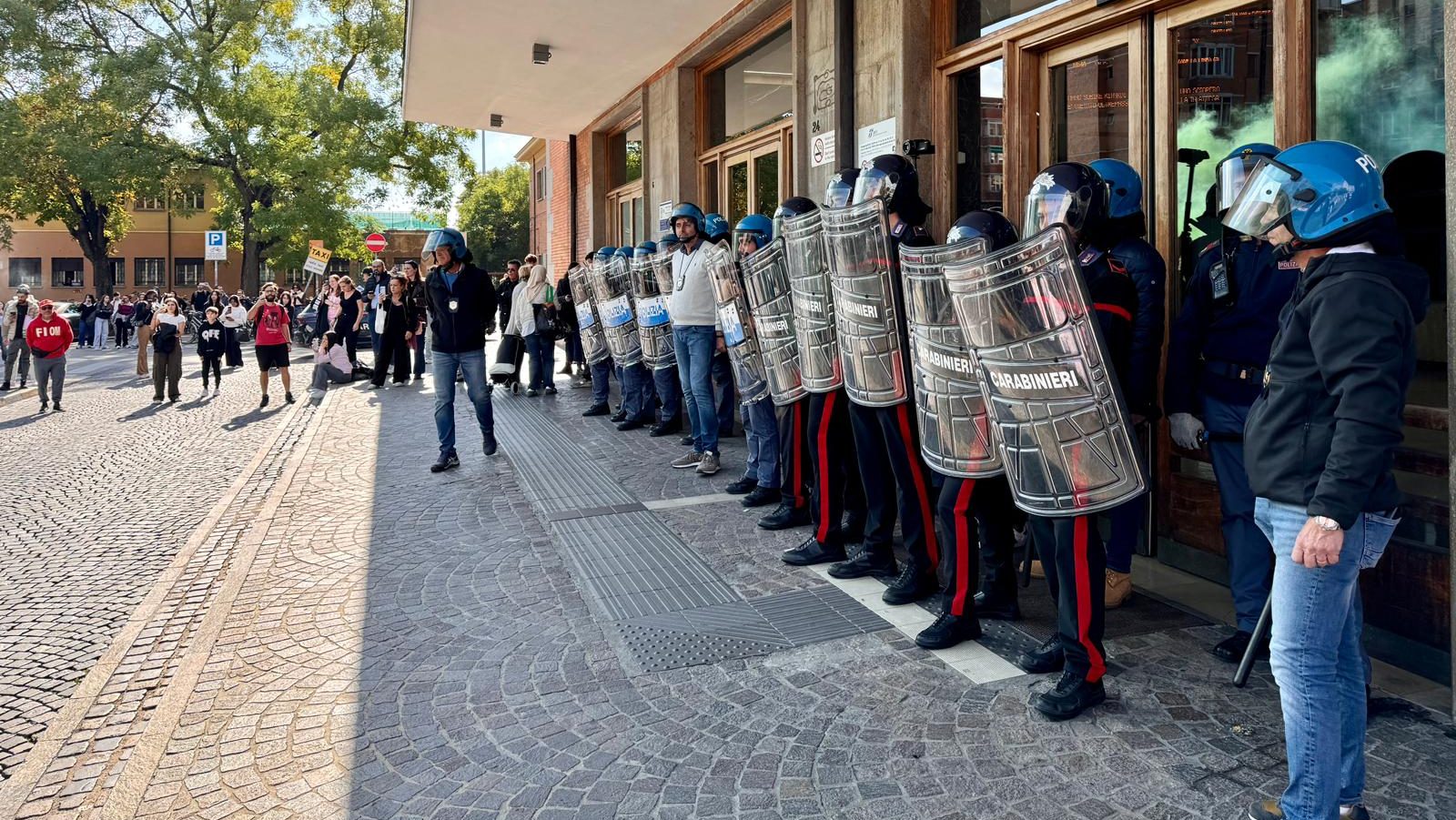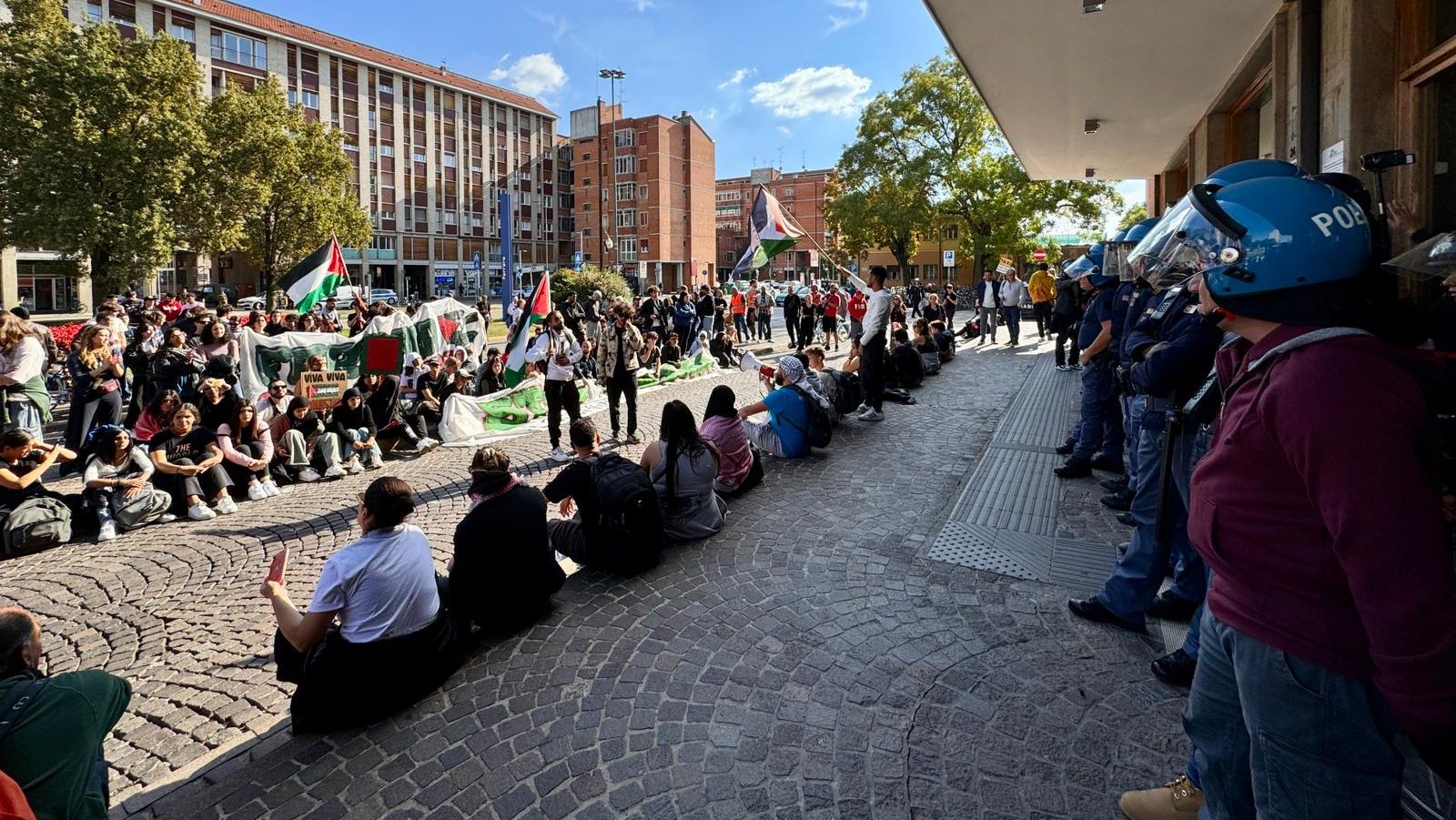 Aria tesa nel piazzale davanti alla stazione di Ferrara dove, intorno alle 14 di venerdì 3 ottobre, circa trecento manifestanti – che in mattinata avevano partecipato al corteo organizzato dopo lo sciopero generale nazionale proclamato da Cgil e Usb – hanno spontaneamente raggiunto lo scalo ferroviario con l’obiettivo di occupare i binari e fermare i treni.