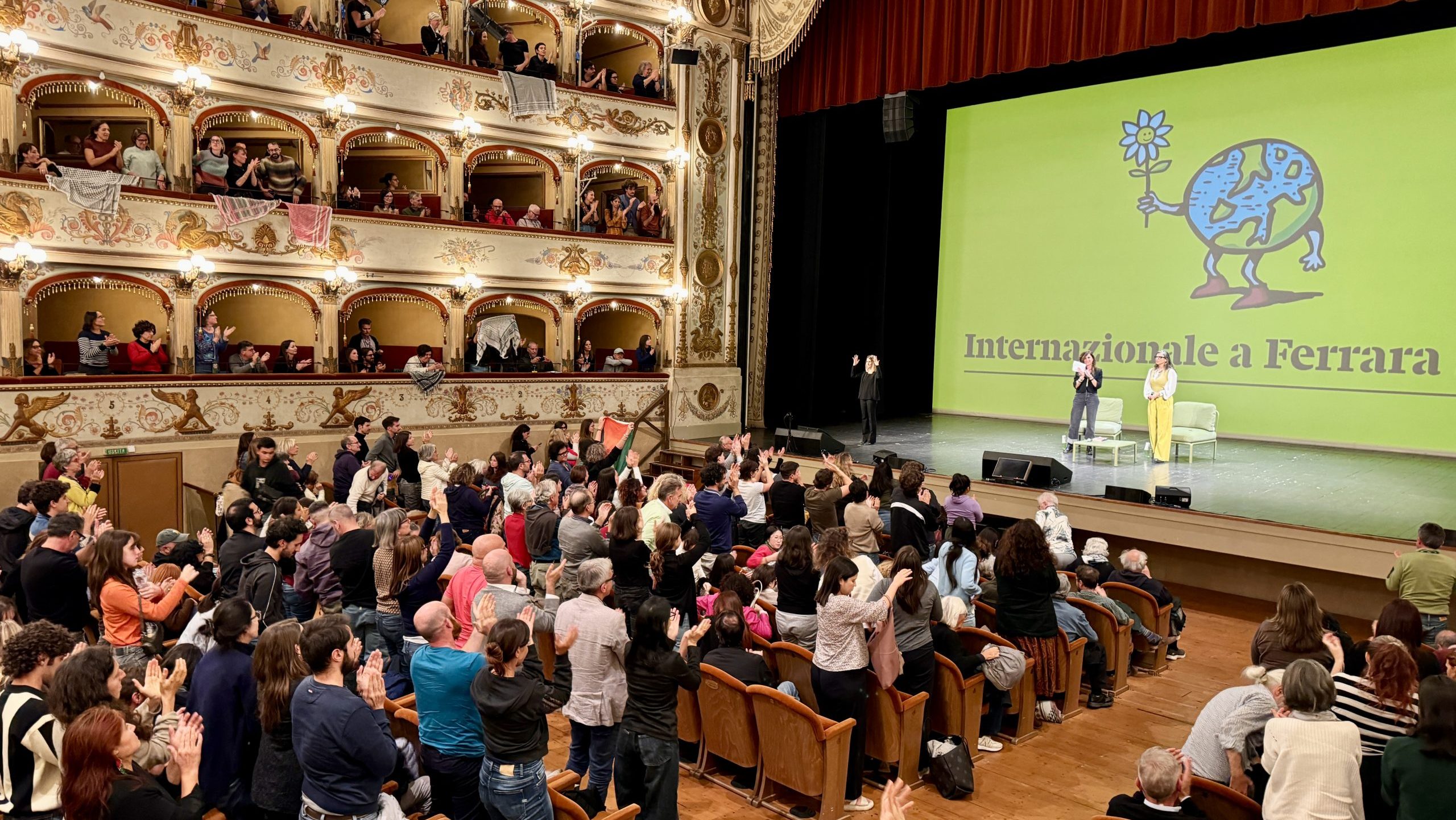 Non c’era più un posto libero al Teatro Comunale per l’incontro del Festival Internazionale che ha visto sul palco Francesca Albanese, relatrice speciale Onu, intervistata da Francesca Agnetti. I biglietti erano andati esauriti in poche ore e già all’ingresso si percepiva l’emozione e l’attesa: dai palchetti sventolavano kefiah e bandiere palestinesi, in un’atmosfera che mescolava la solennità del teatro alla passione di una piazza.
