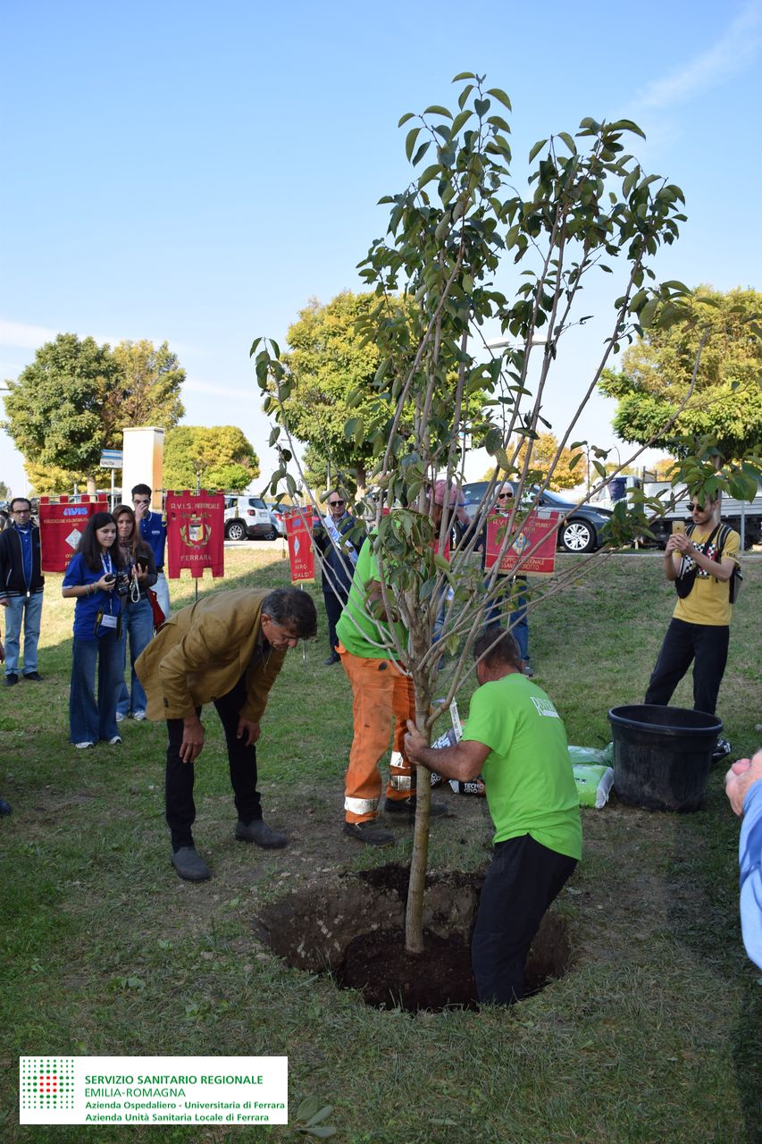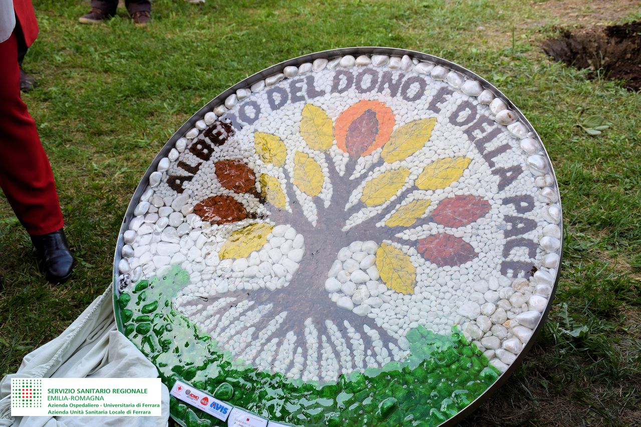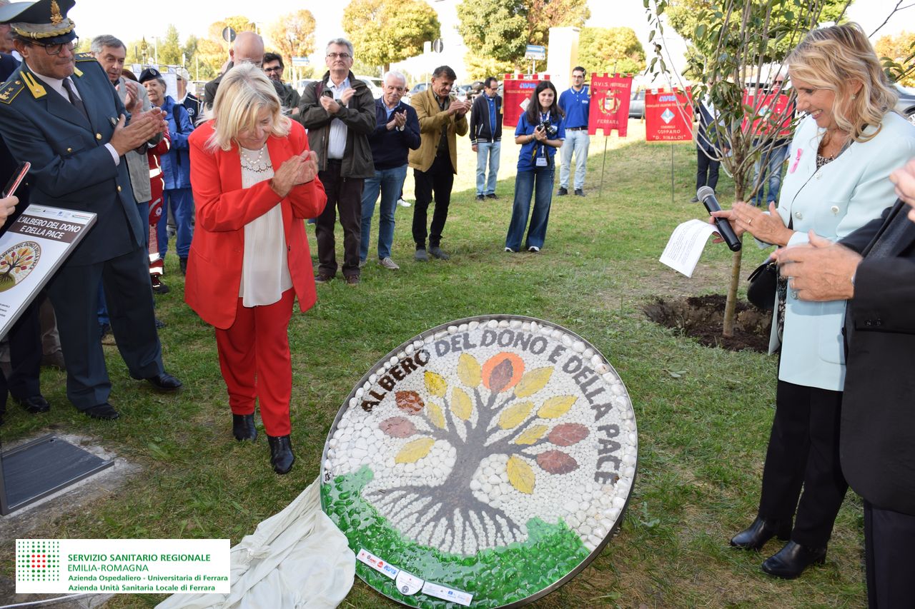 Nicoletta Natalini, direttrice Generale delle Aziende Sanitarie ferraresi, ha aggiunto: “Vorrei ringraziare Avis e tutte le associazioni che si occupano della donazione, proseguendo in quella che è la tradizione della piantumazione degli alberi all’interno del giardino del donatori. L’albero di Kaki, non è solo simbolo di pace, ma anche di resilienza e adattamento, essendo sopravvissuto ai bombardamenti di Hiroshima e Nagasaki. È simbolico che entri a pieno titolo nel Giardino dei Donatori, collocato di fronte al servizio di riabilitazione San Giorgio. Oltre alla piantumazione scopriamo oggi il mosaico artistico realizzato dal maestro Raffaele Ghelfi, un’opera che ha richiesto 118 ore di lavoro con pietre di marmo e resina. L’evento racchiude il significato più ampio del lavoro di Avis e di tutte le Associazioni che si occupano del dono”.