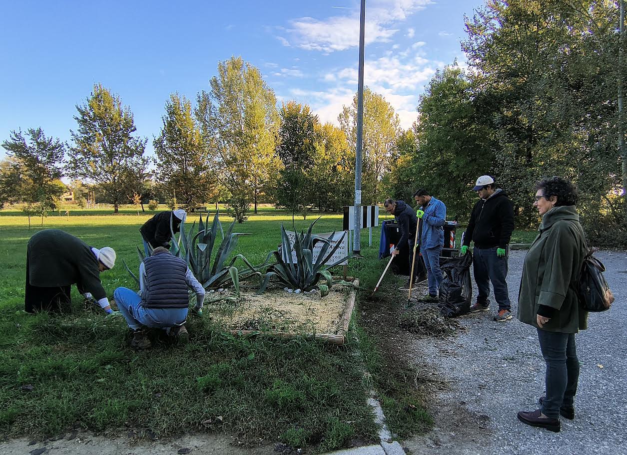 Nella mattinata di mercoledì 16 ottobre, al pontino Tagliapietra, i cinque partecipanti al laboratorio, assieme alla coordinatrice Lisa Tosi, hanno svolto una delle prime attività concordate con il Comune di Copparo che collabora al progetto, pulendo l’aiuola presente all’ingresso dell’area verde.