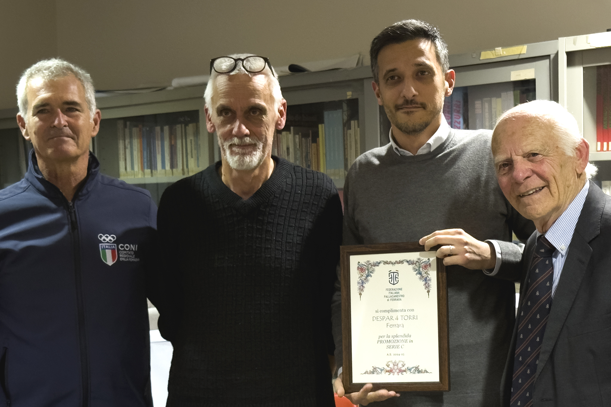 Lunedì sera, nella sala riunioni di Sport e Salute del Coni di via Bongiovanni a Ferrara, la Despar 4 Torri ha ricevuto il riconoscimento, da parte della Fip provinciale, per la vittoria nel campionato di Divisione Regionale 1 2024-2025, insieme a tutte le altre società estensi vincitrici nella stagione passata.