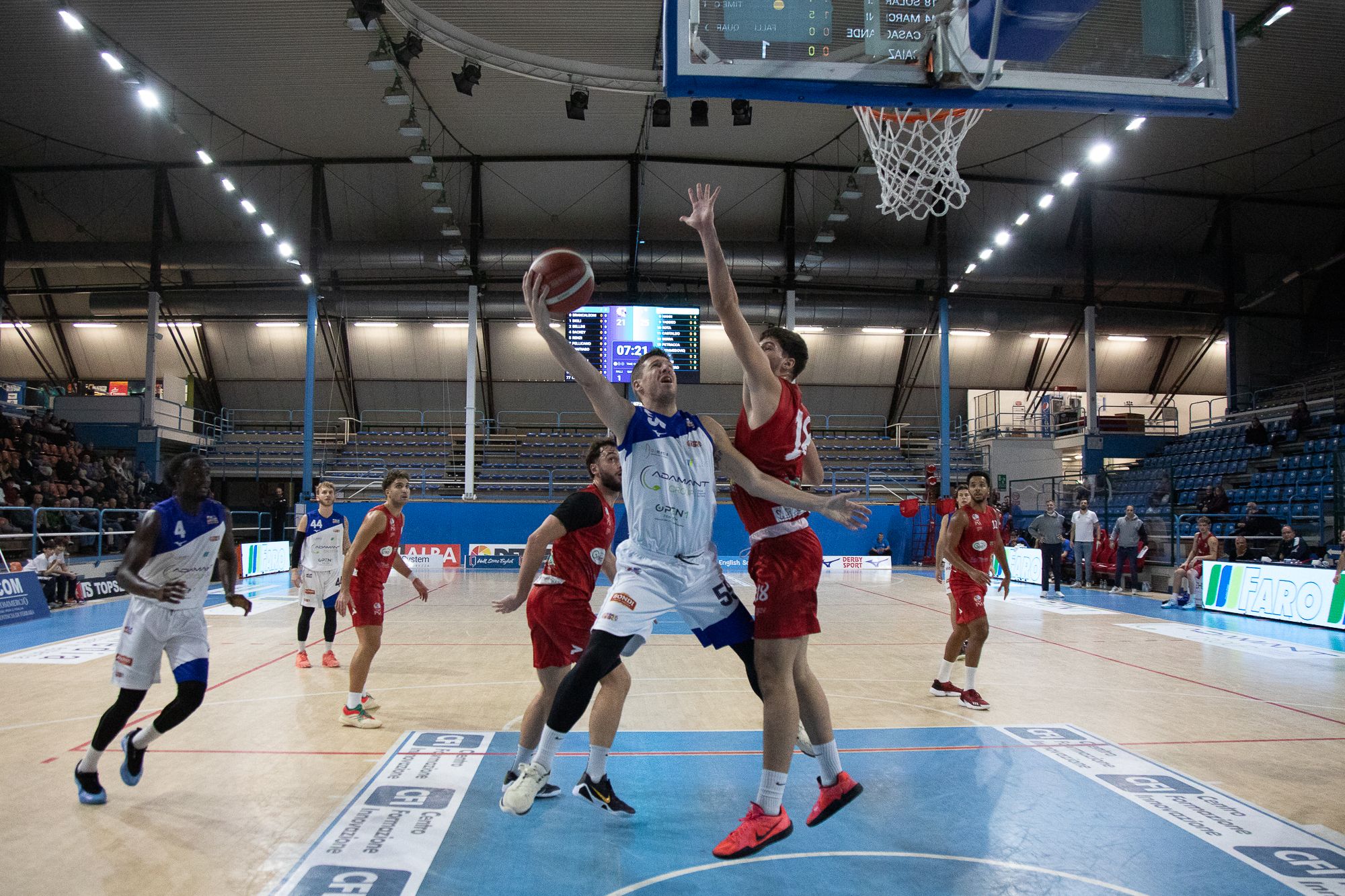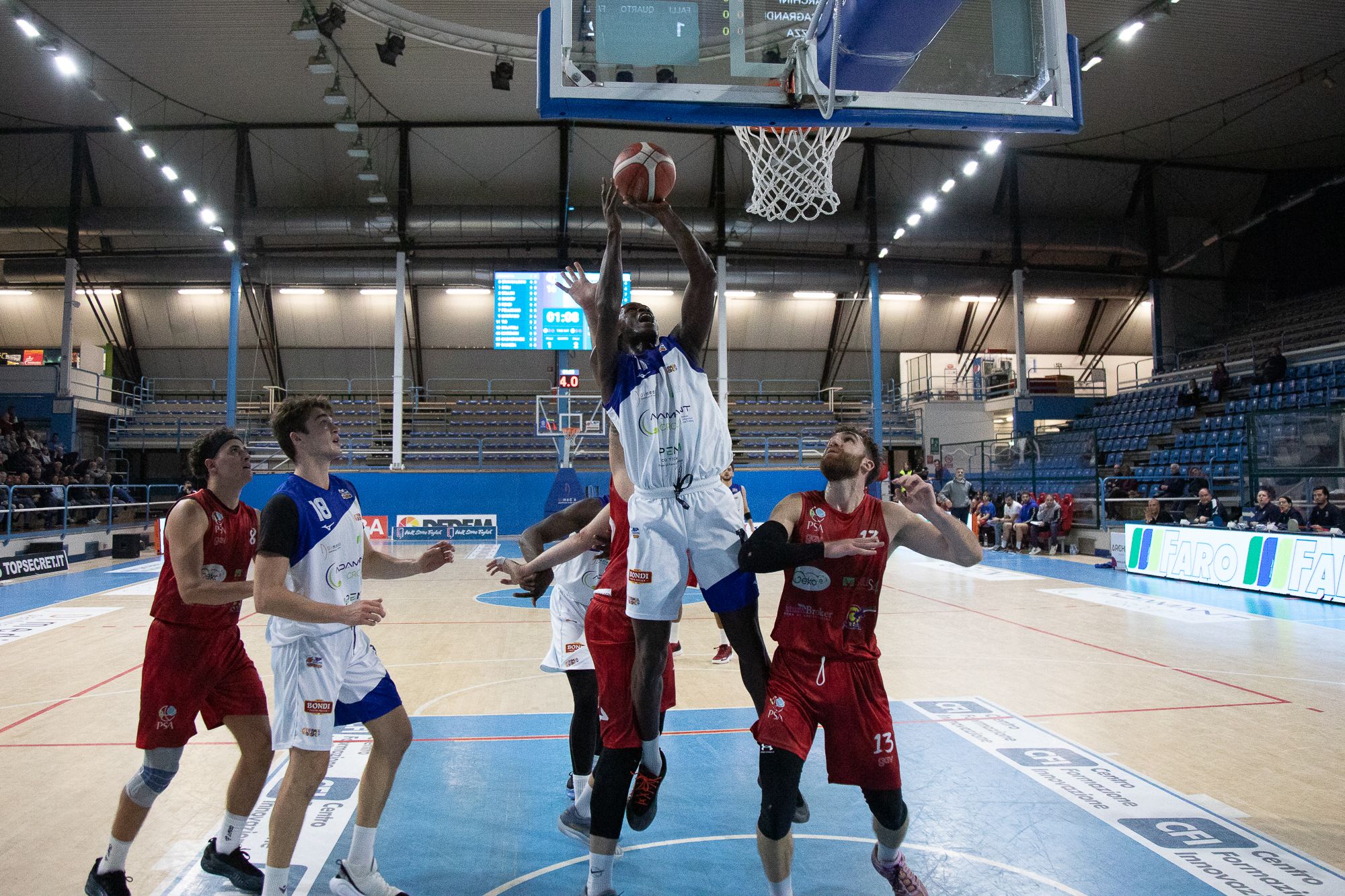 Coach Gandini si fa espellere per proteste, e, quando Casoria prova a riaggredire la gara, è Casagrande a rispedire indietro gli ospiti. La Psa però ci crede, Ferrara lascia il manubrio della gara forse troppo presto e Seck centra il 67-54. L’Adamant si rimette subito in carreggiata con l’invenzione di Pellicano, e Sackey chiude i conti: i biancazzurri trovano la prima vittoria casalinga di stagione con il risultato di 80-64.