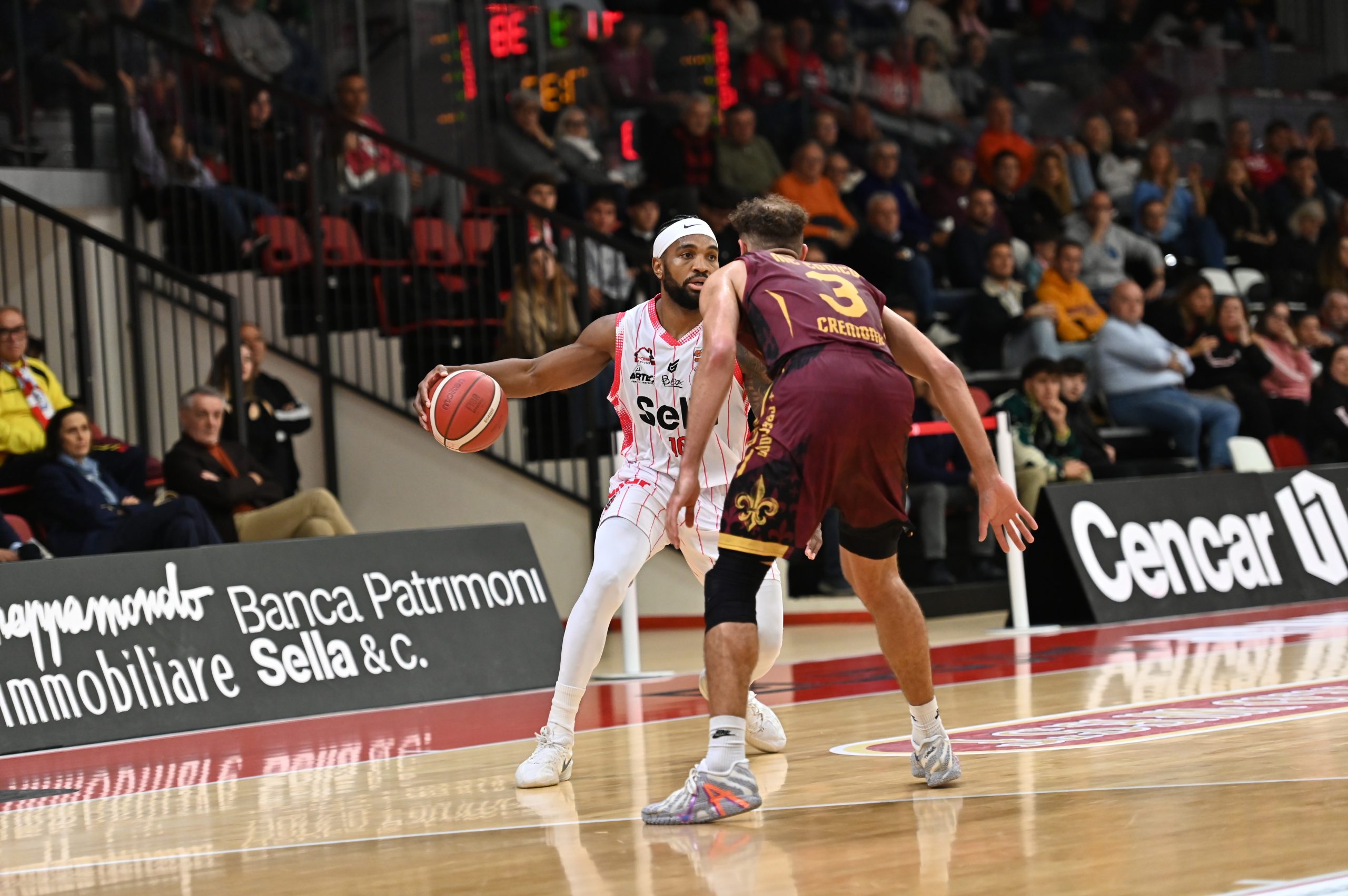 Nel secondo quarto Cremona prova a rientrare con due triple di McConico e una di Allinei, ma la Sella risponde affidandosi ai primi punti di Davis e all’esperienza di Montano, toccando il massimo vantaggio sul 42-29 e costringendo gli ospiti al time-out.