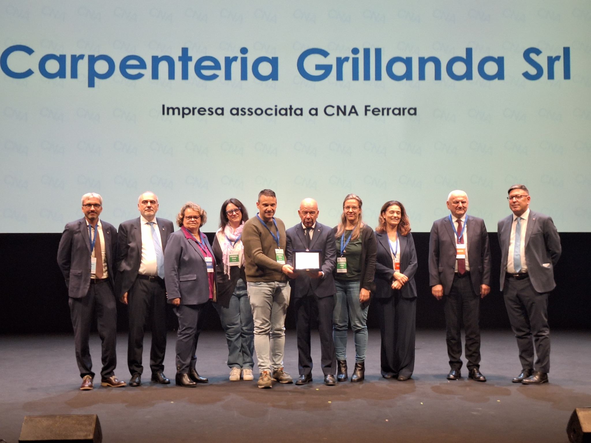 Il premio è stato ritirato da Marco Grillanda, terza generazione in azienda, nipote del fondatore, insieme alle dipendenti e i dipendenti dell’impresa. Sul palco con Marco, il presidente e il segretario regionale di Cna, Paolo Cavini e Diego Benatti, la presidente di Cna Ferrara Jessica Morelli e il direttore Matteo Carion. La Carpenteria Grillanda ha rappresentato l’imprenditoria ferrarese all’assemblea di Cna Emilia Romagna, intitolata “Talenti d’Impresa”.