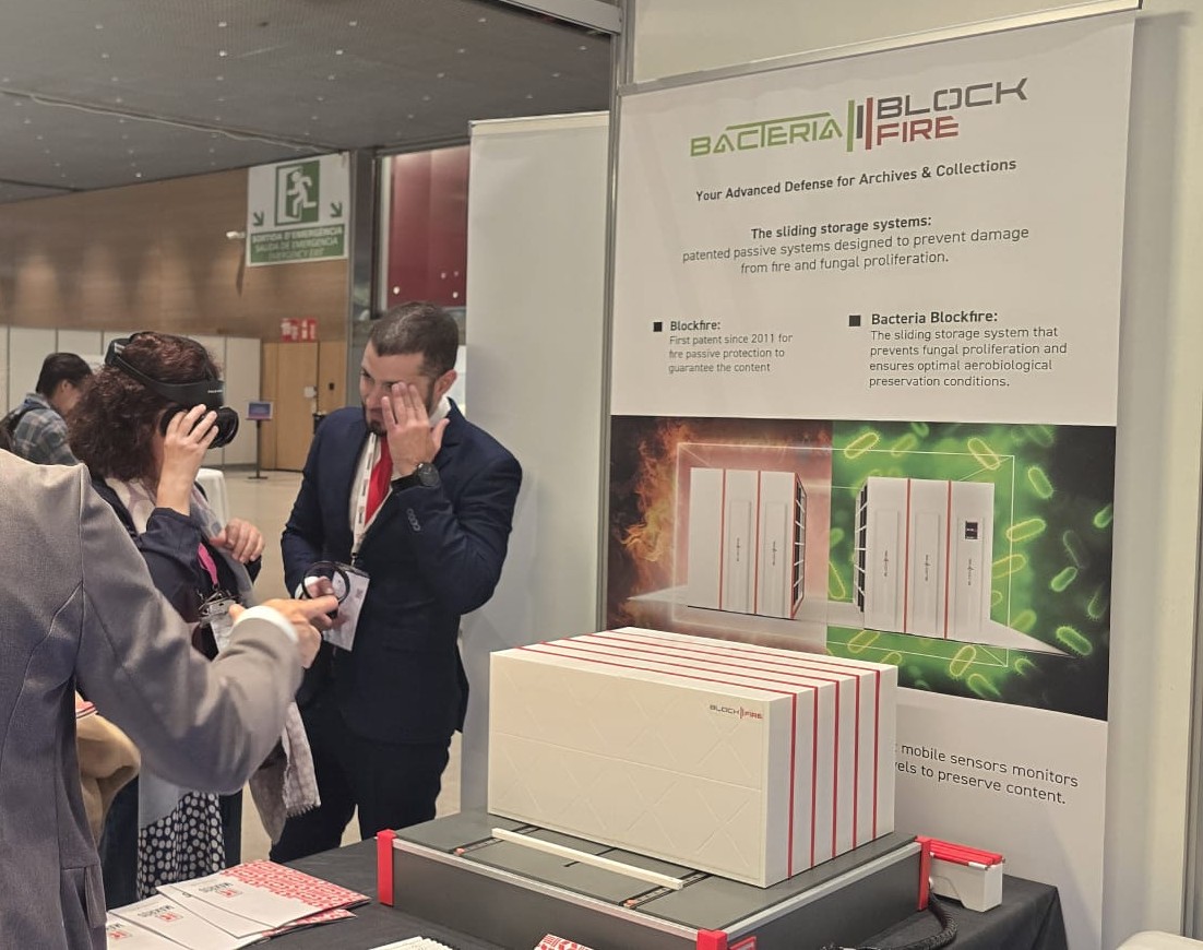 E demo (momento dimostrativo, ndr) agli stand, dove Makros ha portato visori che sfruttando la realtà immersiva consentono a chi li indossa di comprendere in un minuto come agiscono il Blockfire e Blockbacteria. Cliccando su pulsante 1 si può assistere a un incendio che mette a rischio libri e quadri collocati in un Blockfire, che all’arrivo delle fiamme si chiude autonomamente salvaguardando l’integrità del contenuto. Cliccando sul 2, ci si trova accanto al software che governa la sensoristica e l’attivazione degli alert che suggeriscono le azioni da intraprendere per evitare la proliferazione fungina. “Il riscontro di interesse è stato enorme, in particolare dagli americani, che stanno cominciando ad affrontare il tema della conservazione culturale”.