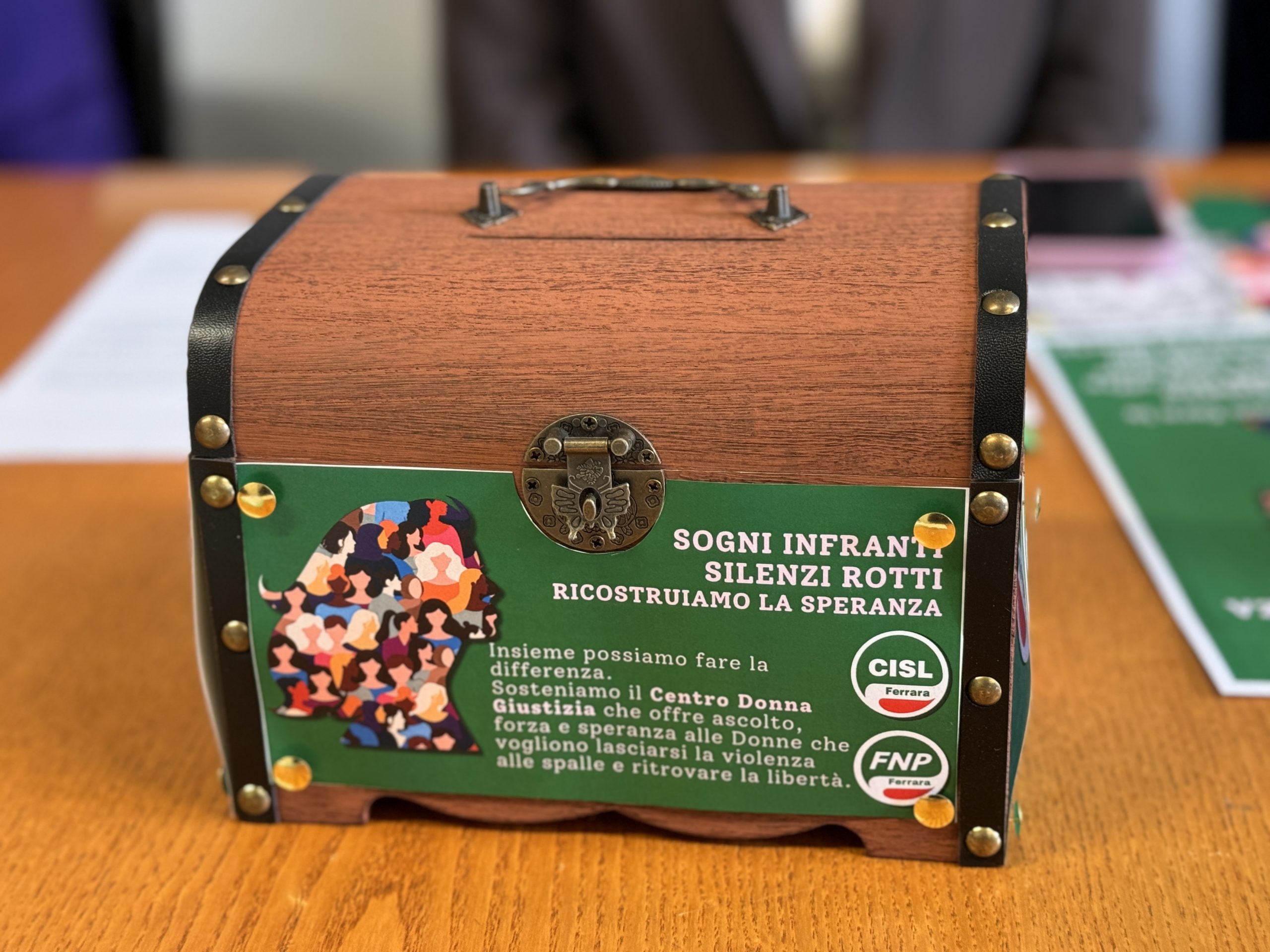 Un piccolo scrigno per un grande gesto. È l’immagine scelta da Cisl Ferrara e Fnp Cisl per l’iniziativa presentata oggi – 21 novembre – in vista della Giornata internazionale per l’eliminazione della violenza contro le donne: una raccolta fondi diffusa in tutto il territorio a sostegno del Centro Donna Giustizia, realtà di riferimento per le donne che affrontano situazioni di violenza fisica, psicologica ed economica.