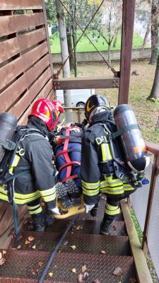 I vigili del Fuoco, muniti di presidi di protezione individuale specifici per contesti emergenziali caratterizzati dalla presenza di fiamme e fumo, hanno recuperato e messo in sicurezza su barella spinale una persona intossicata (naturalmente trattavasi di simulazione) e trasportata, con apposite imbragature, al piano terra, servendosi della scala d’emergenza esterna.