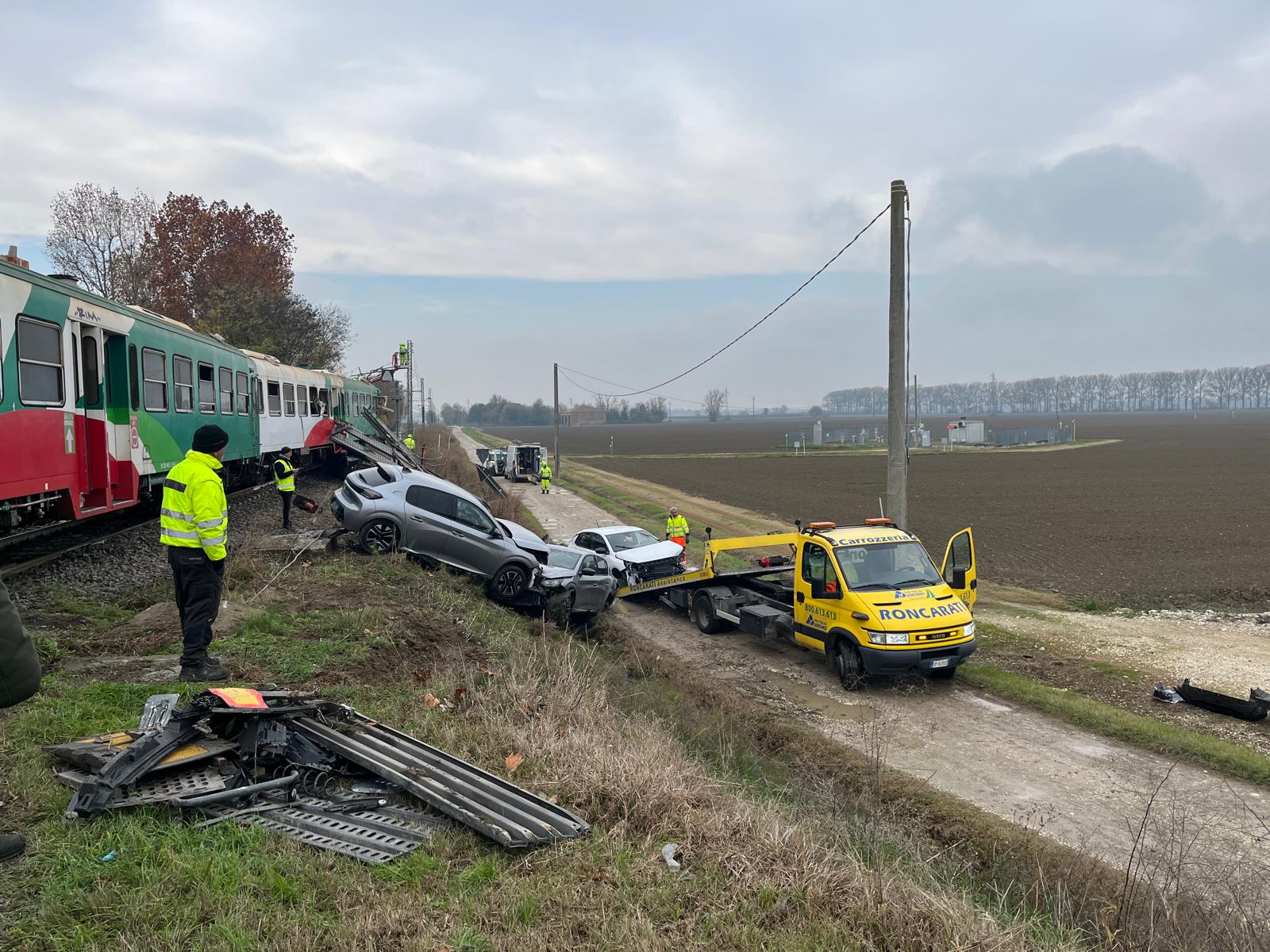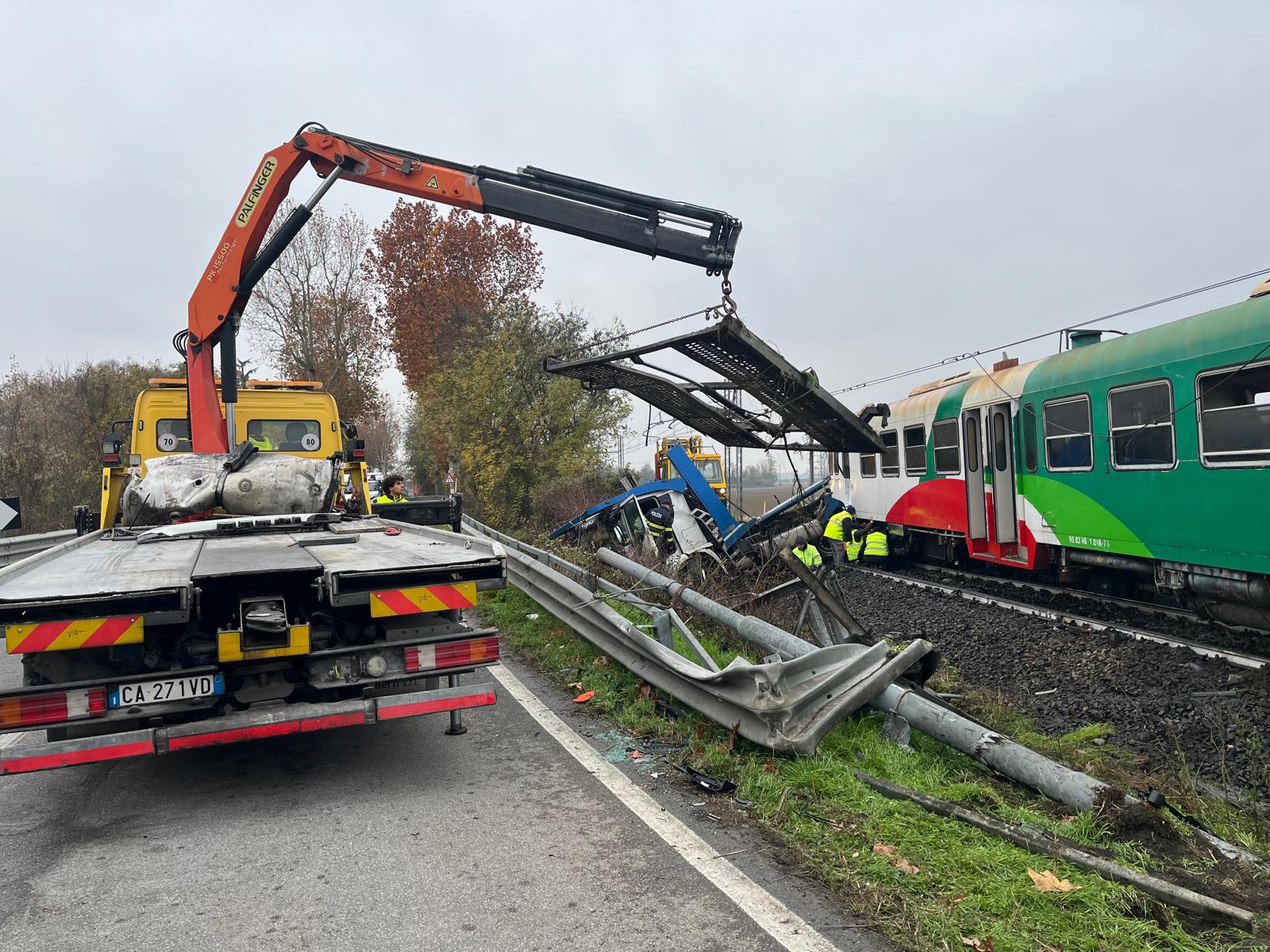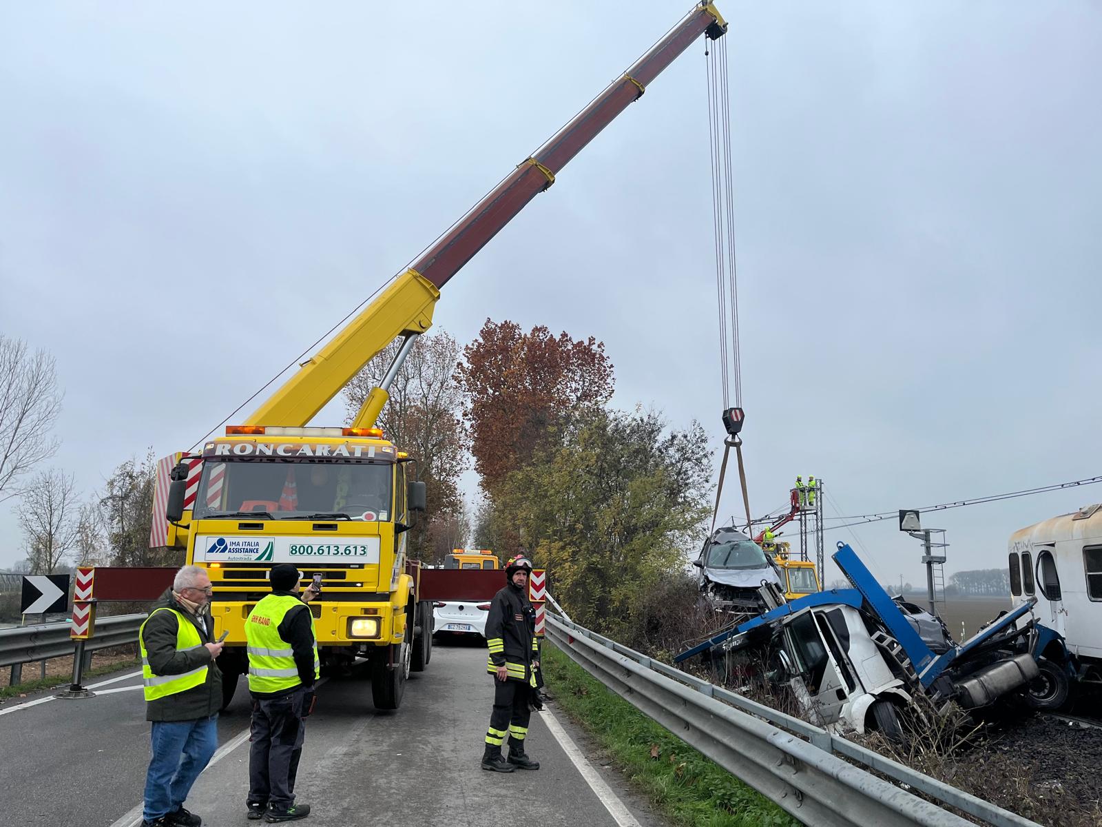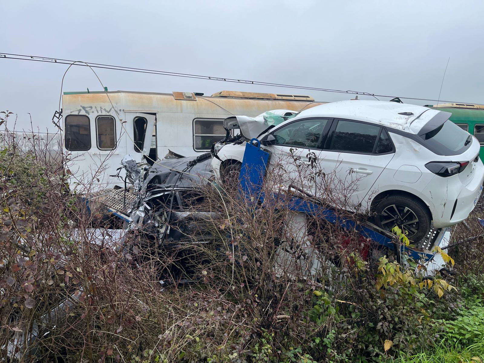 Danni ingenti ai mezzi, al treno e al camion, con diverse automobili trasportate dalla bisarca che sono finite sull’asfalto e sono andate distrutte.