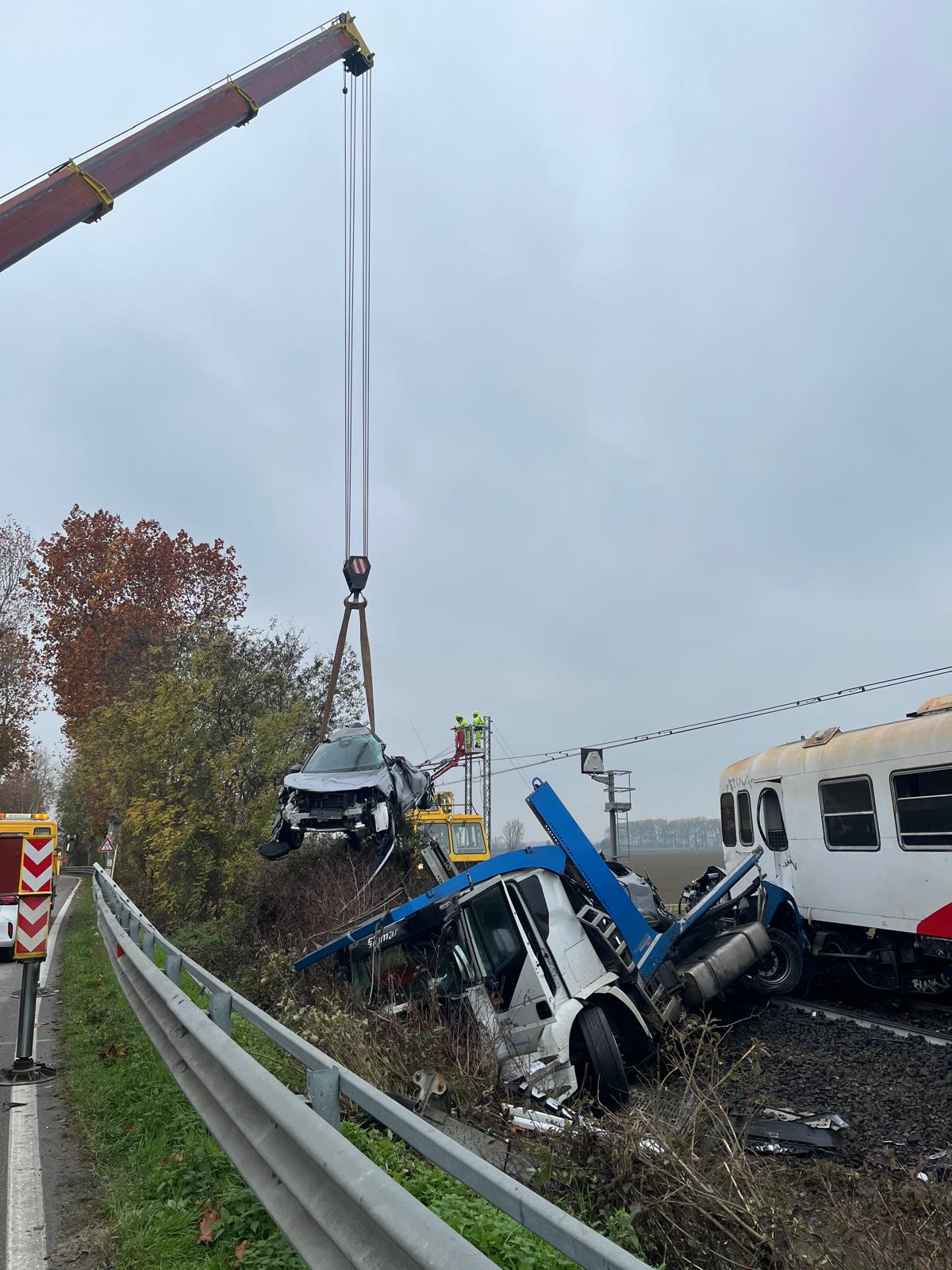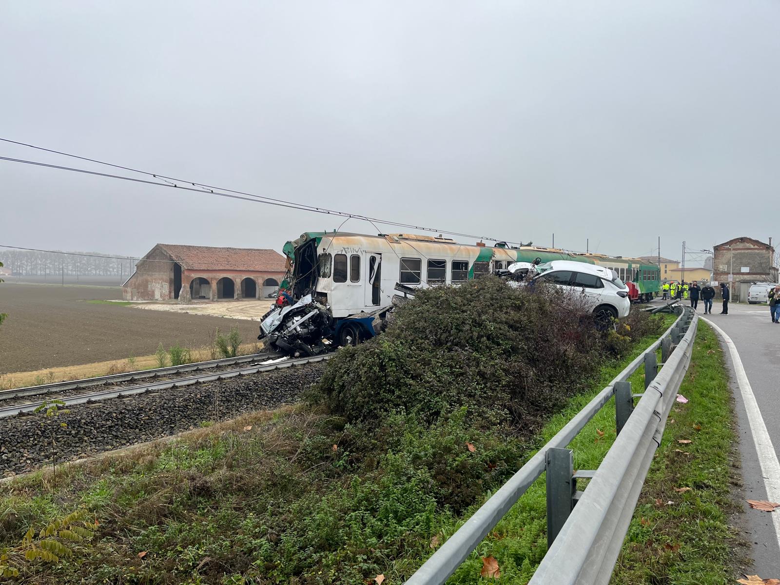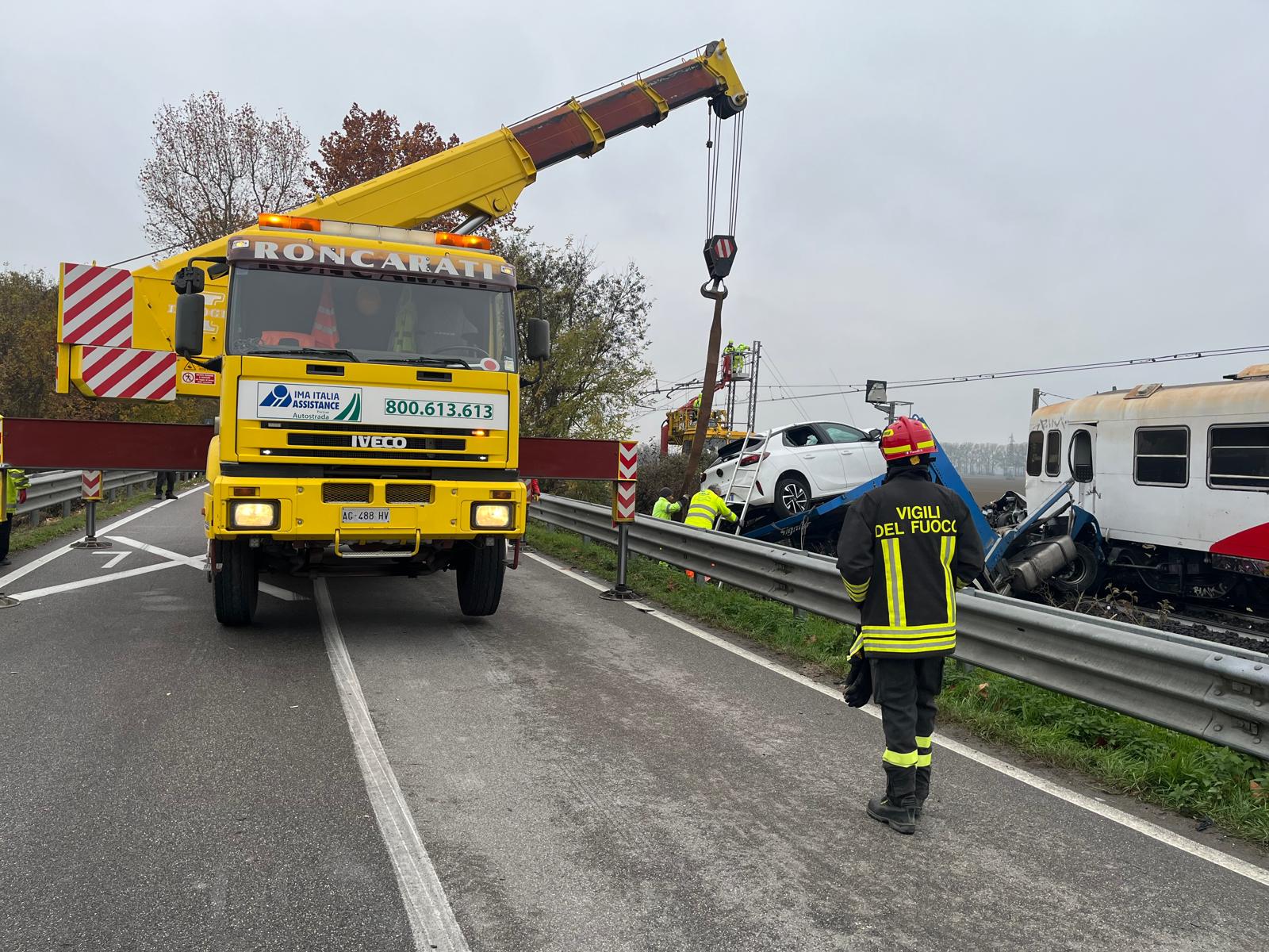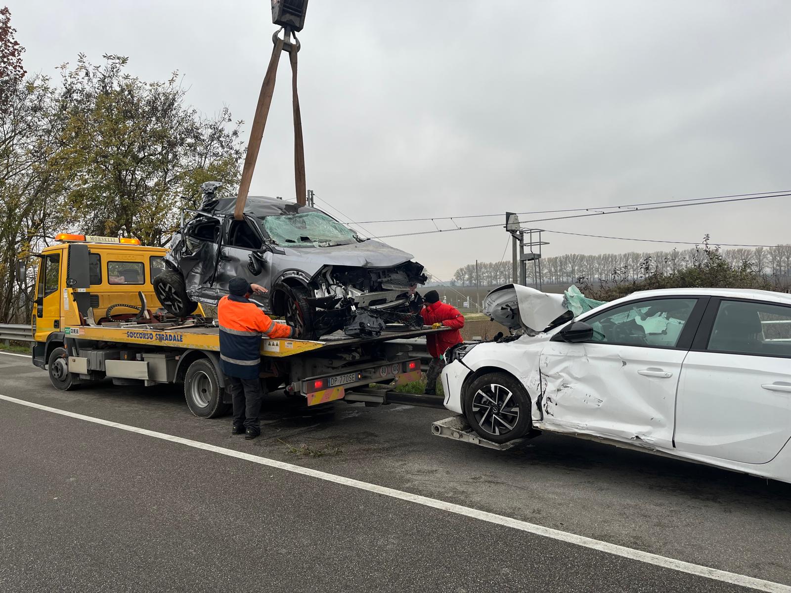 Danni ingenti ai mezzi, al treno e al camion, con diverse automobili trasportate dalla bisarca che sono finite sull’asfalto e sono andate distrutte.
